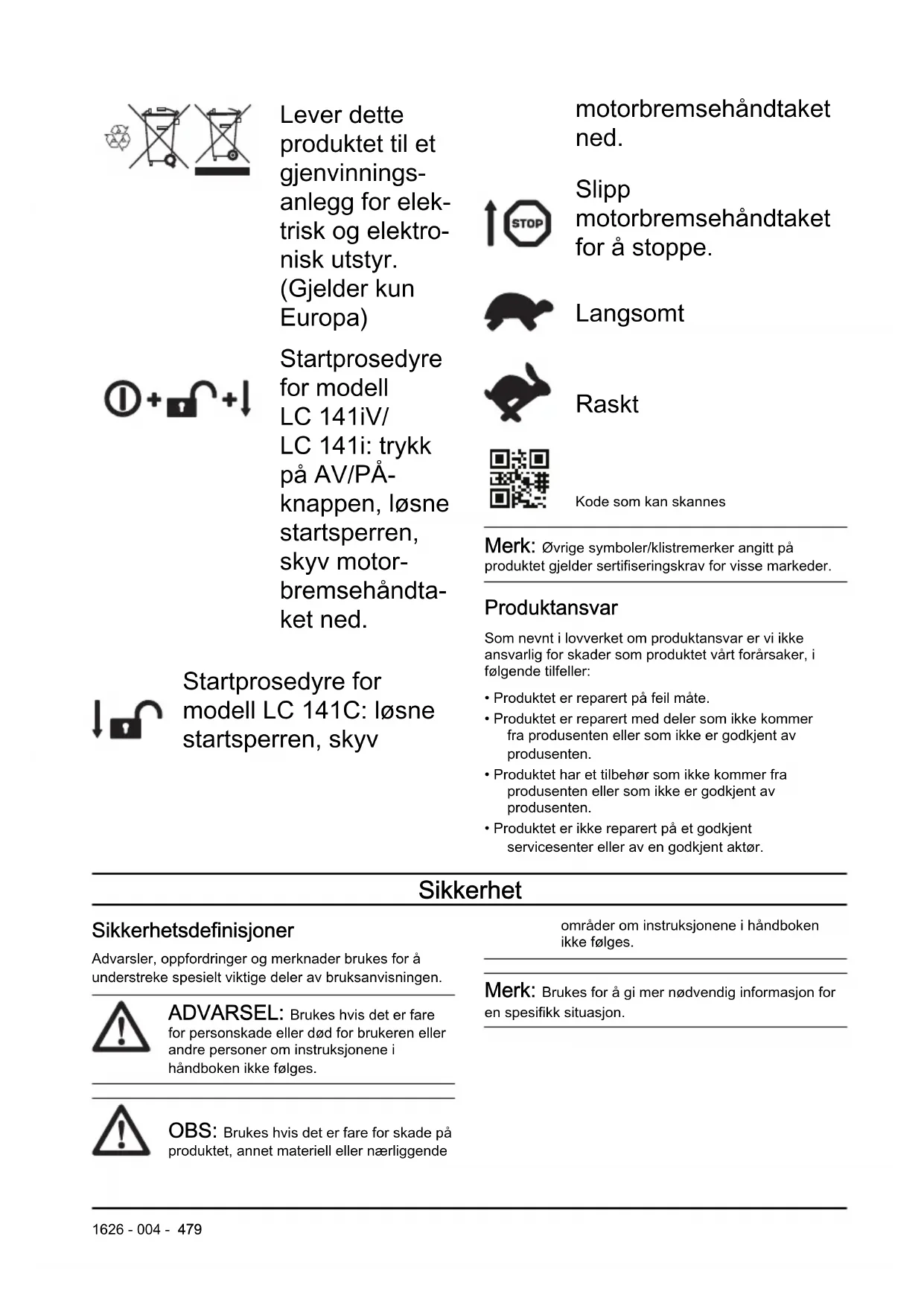 Symboler på produktet Brukeren eller personer i nærheten kan rammes av personskade eller død dersom produktet ikke brukes forsiktig og korrekt. 1626 - 004 - 477Les brukerhåndboken og forsikre deg om at du forstår instruksjonene før du bruker produktet. Hold personer og dyr på trygg avstand fra arbeidsområdet. Se opp for gjenstander som slynges ut og rikosjetterer. Advarsel: Hold hender og føtter borte fra den roterende kniven. Advarsel: Hold hender og føtter borte fra bevegelige deler. Ta ut tenningsnøkkelen før du utfører vedlikehold på produktet. (modell LC 141iV/LC 141i) Koble produktet fra strømuttaket før du utfører vedlikehold på produktet. (modell LC 141C) IPX1 – Produktet har beskyttelse mot dryppende vann (modell LC 141iV/LC 141i) IPX4 – Produktet har beskyttelse mot vannsprut (modell LC 141C) Ikke la det regne på produktet (modell LC 141iV/LC 141i) Advarsel: Klipp ikke over strømledningen. Dette kan føre til elektrisk støt og/eller skade på produktet. (modell LC 141C) Dette produktet er i overensstemmelse med gjeldende EU-direktiver. Støyutslipp til omgivelsene ifølge EFs direktiv. Produktutslippene angis i kapittelet Tekniske data og på klistremerket. Direktestrøm. 36 V Dobbeltisolert. 478 1626 - 004 -Lever dette produktet til et gjenvinnings- anlegg for elek- trisk og elektro- nisk utstyr. (Gjelder kun Europa) Startprosedyre for modell LC 141iV/ LC 141i: trykk på AV/PÅ- knappen, løsne startsperren, skyv motor- bremsehåndta- ket ned. Startprosedyre for modell LC 141C: løsne startsperren, skyv motorbremsehåndtaket ned. Slipp motorbremsehåndtaket for å stoppe. Langsomt Raskt Kode som kan skannes Merk: Øvrige symboler/klistremerker angitt på produktet gjelder sertifiseringskrav for visse markeder. Produktansvar Som nevnt i lovverket om produktansvar er vi ikke ansvarlig for skader som produktet vårt forårsaker, i følgende tilfeller: