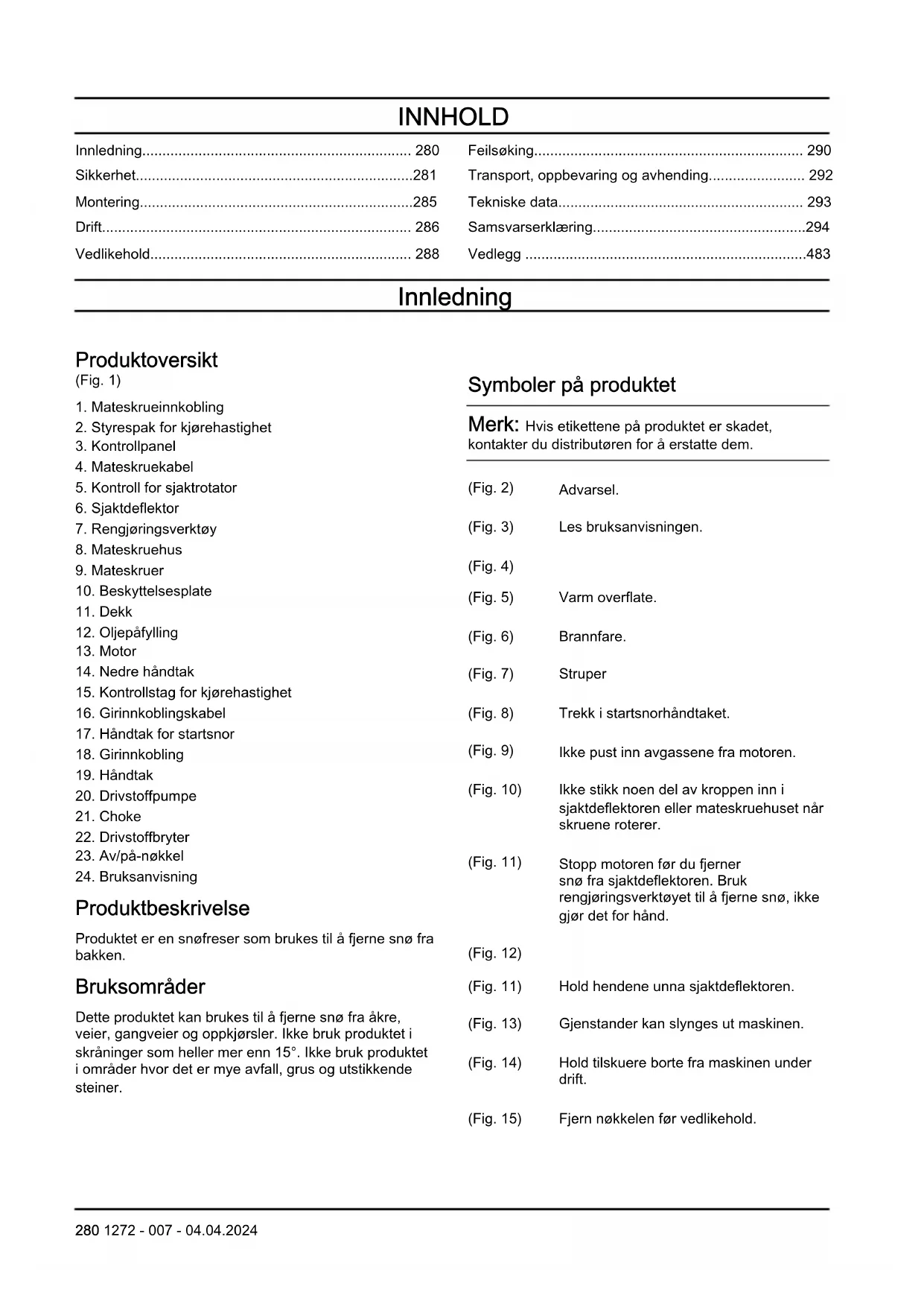 Produktbeskrivelse Produktet er en snøfreser som brukes til å fjerne snø fra bakken. Bruksområder Dette produktet kan brukes til å fjerne snø fra åkre, veier, gangveier og oppkjørsler. Ikke bruk produktet i skråninger som heller mer enn 15°. Ikke bruk produktet i områder hvor det er mye avfall, grus og utstikkende steiner. Symboler på produktet Merk: Hvis etikettene på produktet er skadet, kontakter du distributøren for å erstatte dem. (Fig. 2) Advarsel. (Fig. 3) Les bruksanvisningen. (Fig. 4) (Fig. 5) Varm overflate. (Fig. 6) Brannfare. (Fig. 7) Struper (Fig. 8) Trekk i startsnorhåndtaket. (Fig. 9) Ikke pust inn avgassene fra motoren. (Fig. 10) Ikke stikk noen del av kroppen inn i sjaktdeflektoren eller mateskruehuset når skruene roterer. (Fig. 11) Stopp motoren før du fjerner snø fra sjaktdeflektoren. Bruk rengjøringsverktøyet til å fjerne snø, ikke gjør det for hånd. (Fig. 12) (Fig. 11) Hold hendene unna sjaktdeflektoren. (Fig. 13) Gjenstander kan slynges ut maskinen. (Fig. 14) Hold tilskuere borte fra maskinen under drift. (Fig. 15) Fjern nøkkelen før vedlikehold. 280 1272 - 007 - 04.04.2024(Fig. 16) Trykk inn av/på-nøkkelen til posisjonen RUN (START). (Fig. 17) Sett drivstoffbryteren i posisjonen ON (PÅ). (Fig. 18) Trykk på drivstoffpumpen. (Fig. 19) Fare for fall. (Fig. 20) Beveg deg langsomt bakover. (Fig. 21) Bruk godkjente vernehansker. (Fig. 22) Bruk vernehjelm. Bruk godkjent hørselsvern. Bruk godkjent øyevern. (Fig. 23) Støyutslipp til omgivelsene i henhold til EU-direktiv 2000/14/EF og New South Wales-forskriften «Protection of the Environment Operations (Noise Control) Regulation 2017». Du finner informasjon om støyutslipp på maskinetiketten og i kapittelet Tekniske data. (Fig. 24) Dette produktet er i overensstemmelse med gjeldende EU-direktiver. (Fig. 25) Dette produktet samsvarer med gjeldende britiske forskrifter. Merk: Øvrige symboler/klistremerker angitt på produktet gjelder sertifiseringskrav for visse markeder. Euro V-utslipp ADVARSEL: Tukling med motoren opphever EU-type-godkjenningen til dette produktet. Produsent Husqvarna AB Drottninggatan 2, SE-561 82 Huskvarna Skader på produktet Vi er ikke ansvarlige for skader på produktet vårt hvis: