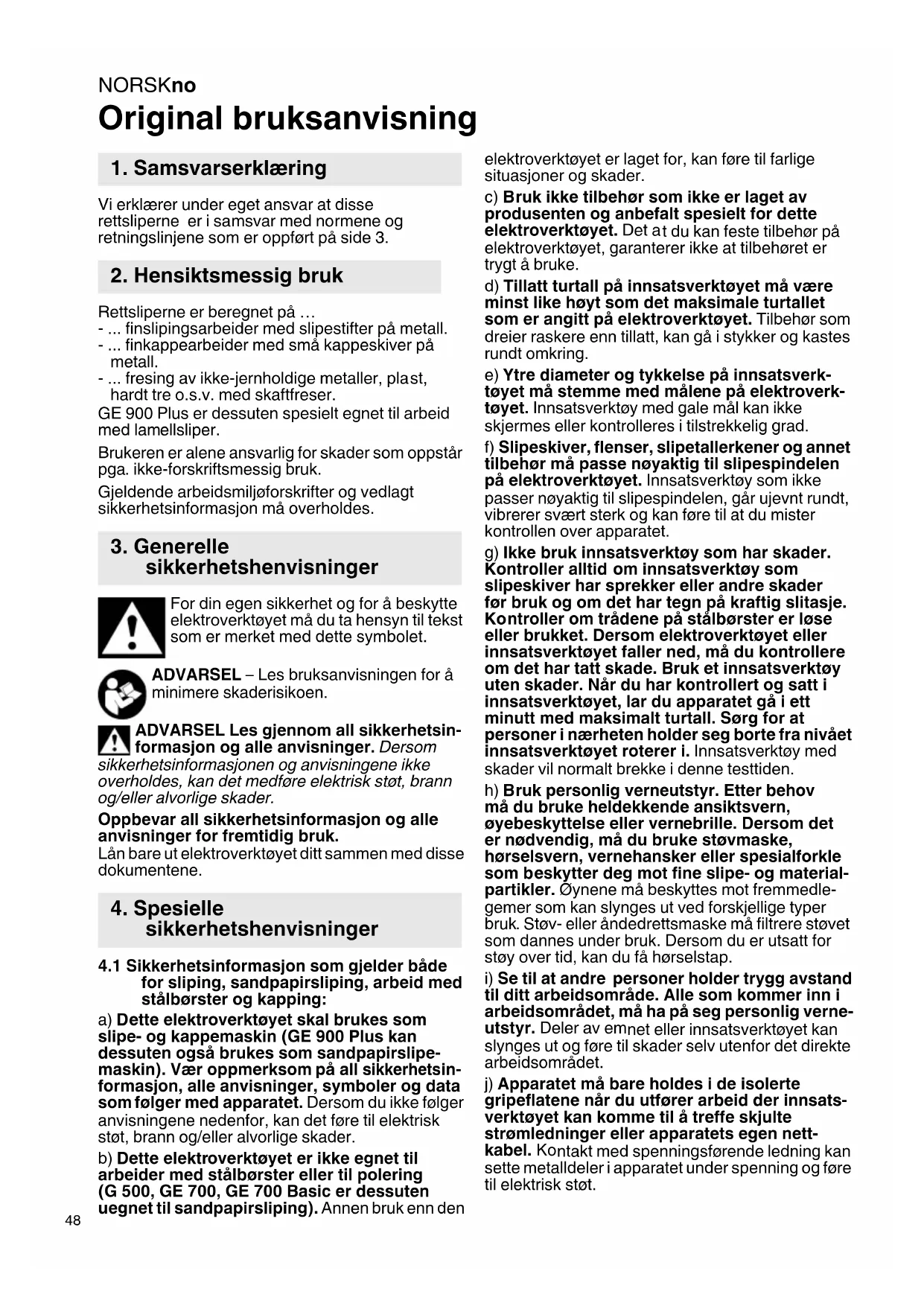 for sliping, sandpapirsliping, arbeid med stålbørster og kapping: a) D ette elektroverktøyet skal brukes som slipe- og kappemaskin (GE 900 Plus kan dessuten også brukes som sandpapirslipe- maskin). Vær oppmerksom på all sikkerhets in- formasjon, alle anvisninger, symboler og data som følger med apparatet. Dersom du ikke følger anvisningene nedenfor, kan det føre til elektrisk støt, brann og/eller alvorlige skader. b) Dette elektr overktøyet er ikke egnet til arbeider med stålbørster eller til polering (G 500, GE 700, GE 700 Basic er dessuten