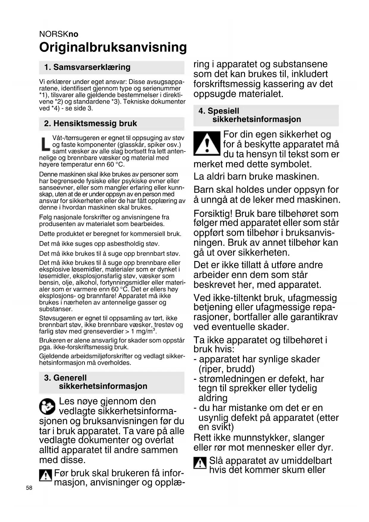 Originalbruksanvisning Vi erklærer under eget ansvar: Disse avsugsappa- ratene, identifisert gjennom type og serienummer *1), tilsvarer alle gjeldende bestemmelser i direkti- vene *2) og standardene *3). Tekniske dokumenter ved *4) - se side 3. Våt-/tørrsugeren er egnet til oppsuging av støv og faste komponenter (glasskår, spiker osv.) samt væsker av alle slag bortsett fra lett anten- nelige og brennbare væsker og material med høyere temperatur enn 60 °C. Denne maskinen skal ikke brukes av personer som har begrensede fysiske eller psykiske evner eller sanseevner, eller som mangler erfaring eller kunn- skap, uten at de er under oppsyn av en person med ansvar for sikkerheten eller de har fått opplæring av denne i hvordan maskinen skal brukes. Følg nasjonale forskrifter og anvisningene fra produsenten av materialet som bearbeides. Dette produktet er beregnet for kommersiell bruk. Det må ikke suges opp asbestholdig støv. Det må ikke brukes til å suge opp brennbart støv. Det må ikke brukes til å suge opp brennbare eller eksplosive løsemidler, materialer som er dynket i løsemidler, eksplosjonsfarlig støv, væsker som bensin, olje, alkohol, fortynningsmidler eller materi- aler som er varmere enn 60 °C. Det er ellers høy eksplosjons- og brannfare! Apparatet må ikke brukes i nærheten av antennelige gasser og substanser. Støvsugeren er egnet til oppsamling av tørt, ikke brennbart støv, ikke brennbare væsker, trestøv og farlig støv med grenseverdier > 1 mg/m³. Brukeren er alene ansvarlig for skader som oppstår pga. ikke-forskriftsmessig bruk. Gjeldende arbeidsmiljøforskrifter og vedlagt sikker- hetsinformasjon må overholdes. Les nøye gjennom den vedlagte sikkerhetsinforma- sjonen og bruksanvisningen før du tar i bruk apparatet. Ta vare på alle vedlagte dokumenter og overlat alltid apparatet til andre sammen med disse. Før bruk skal brukeren få infor- masjon, anvisninger og opplæ- ring i apparatet og substansene som det kan brukes til, inkludert forskriftsmessig kassering av det oppsugde materialet. For din egen sikkerhet og for å beskytte apparatet må du ta hensyn til tekst som er merket med dette symbolet. La aldri barn bruke maskinen. Barn skal holdes under oppsyn for å unngå at de leker med maskinen. Forsiktig! Bruk bare tilbehøret som følger med apparatet eller som står oppført som tilbehør i bruksanvis- ningen. Bruk av annet tilbehør kan gå ut over sikkerheten. Det er ikke tillatt å utføre andre arbeider enn dem som står beskrevet her, med apparatet. Ved ikke-tiltenkt bruk, ufagmessig betjening eller ufagmessige repa- rasjoner, bortfaller alle garantikrav ved eventuelle skader. Ta ikke apparatet og tilbehøret i bruk hvis: - apparatet har synlige skader (riper, brudd) - strømledningen er defekt, har tegn til sprekker eller tydelig aldring - du har mistanke om det er en usynlig defekt på apparatet (etter en svikt) Rett ikke munnstykker, slanger eller rør mot mennesker eller dyr. Slå apparatet av umiddelbart hvis det kommer skum eller