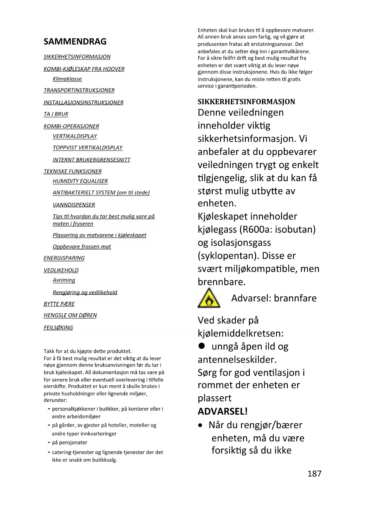 Takk for at du kjøpte dette produktet. For å få best mulig resultat er det viktig at du leser nøye gjennom denne bruksanvisningen før du tar i bruk kjøleskapet. All dokumentasjon må tas vare på for senere bruk eller eventuell overlevering i tilfelle eierskifte. Produktet er kun ment å skulle brukes i private husholdninger eller lignende miljøer, derunder: - personalkjøkkener i butikker, på kontorer eller i andre arbeidsmiljøer - på gårder, av gjester på hoteller, moteller og andre typer innkvarteringer - på pensjonater - catering-tjenester og lignende tjenester der det ikke er snakk om butikksalg. Enheten skal kun brukes til å oppbevare matvarer. All annen bruk anses som farlig, og vil gjøre at produsenten fratas alt erstatningsansvar. Det anbefales at du setter deg inn i garantivilkårene. For å sikre feilfri drift og best mulig resultat fra enheten er det svært viktig at du leser nøye gjennom disse instruksjonene. Hvis du ikke følger instruksjonene, kan du miste retten til gratis service i garantiperioden. SIKKERHETSINFORMASJON Denne veiledningen inneholder viktig sikkerhetsinformasjon. Vi anbefaler at du oppbevarer veiledningen trygt og enkelt tilgjengelig, slik at du kan få størst mulig utbytte av enheten. Kjøleskapet inneholder kjølegass (R600a: isobutan) og isolasjonsgass (syklopentan). Disse er svært miljøkompatible, men brennbare.