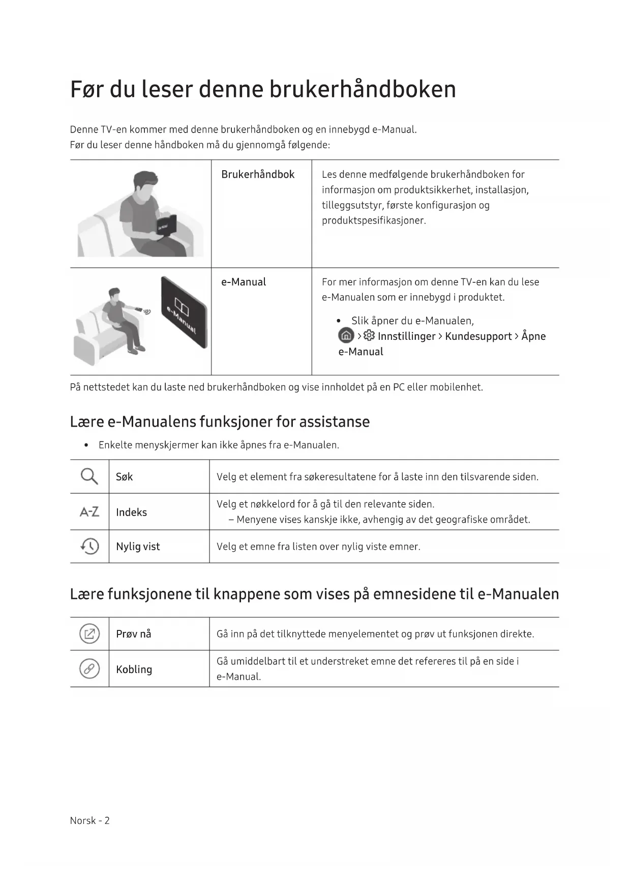- Slik åpner du e-Manualen, > Innstillinger > Kundesupport > Åpne e-Manual På nettstedet kan du laste ned brukerhåndboken og vise innholdet på en PC eller mobilenhet. Lære e-Manualens funksjoner for assistanse