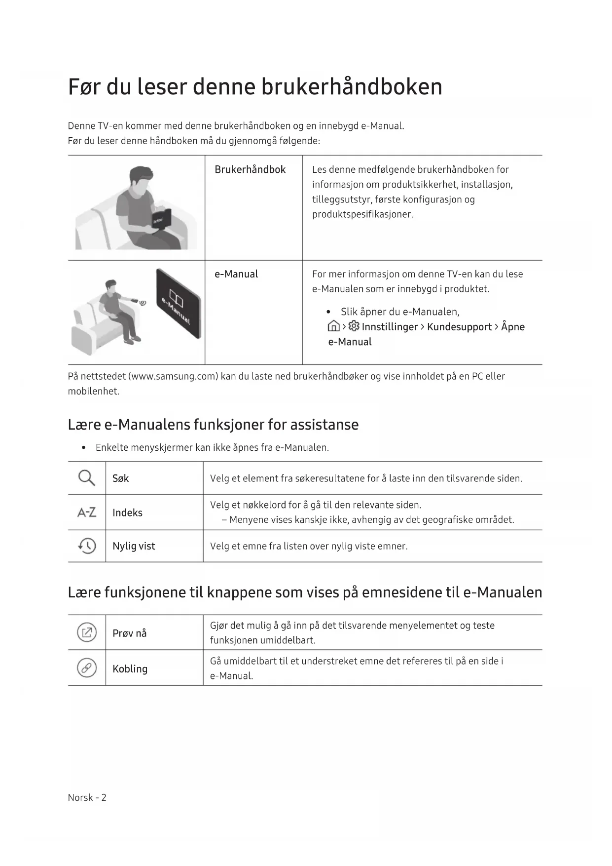 - Slik åpner du e-Manualen, > Innstillinger > Kundesupport > Åpne e-Manual På nettstedet (www.samsung.com) kan du laste ned brukerhåndbøker og vise innholdet på en PC eller mobilenhet. Lære e-Manualens funksjoner for assistanse