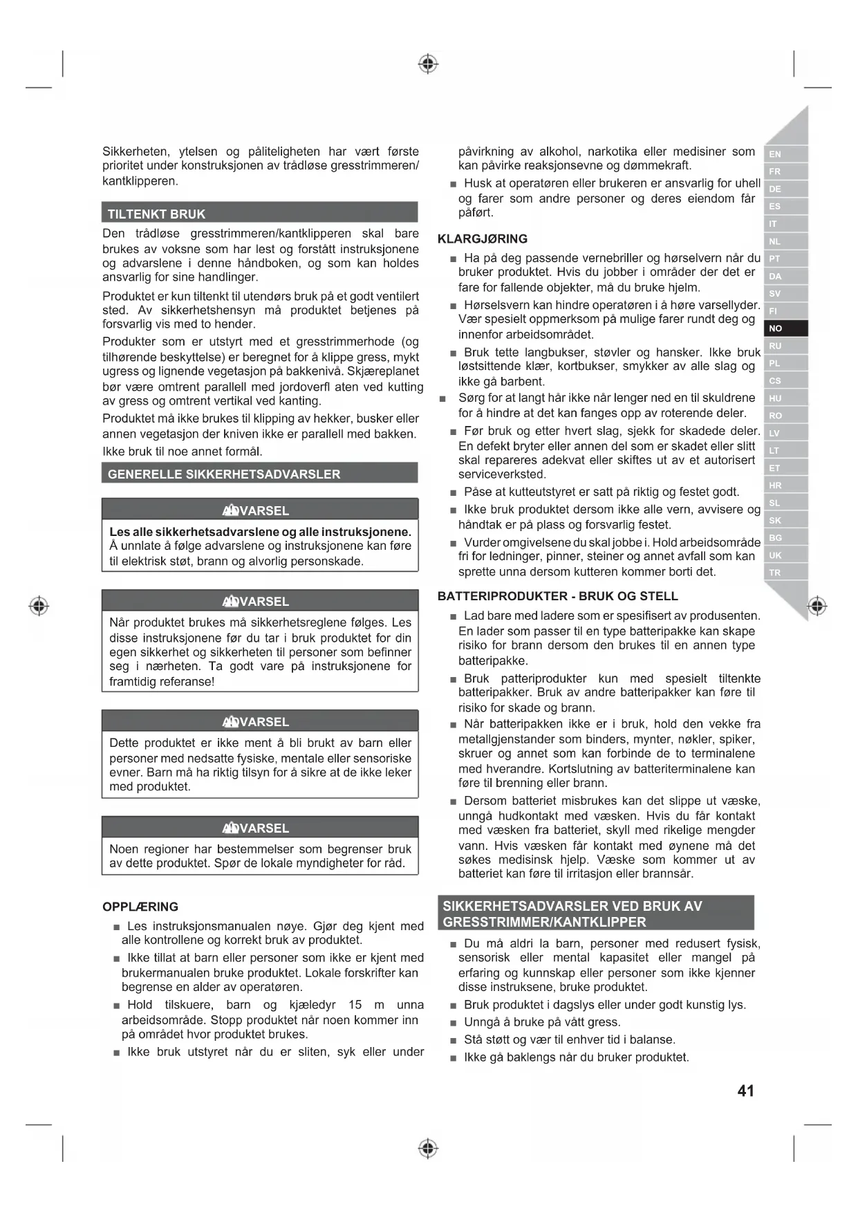 Den tradlose gresstrimmeren/kantklipperen skal bare brukes av voksne som har lest og forstatt instruksjonene og advarslene i/DDne handboken, og som kan holds ansvarlig for sine handlering.