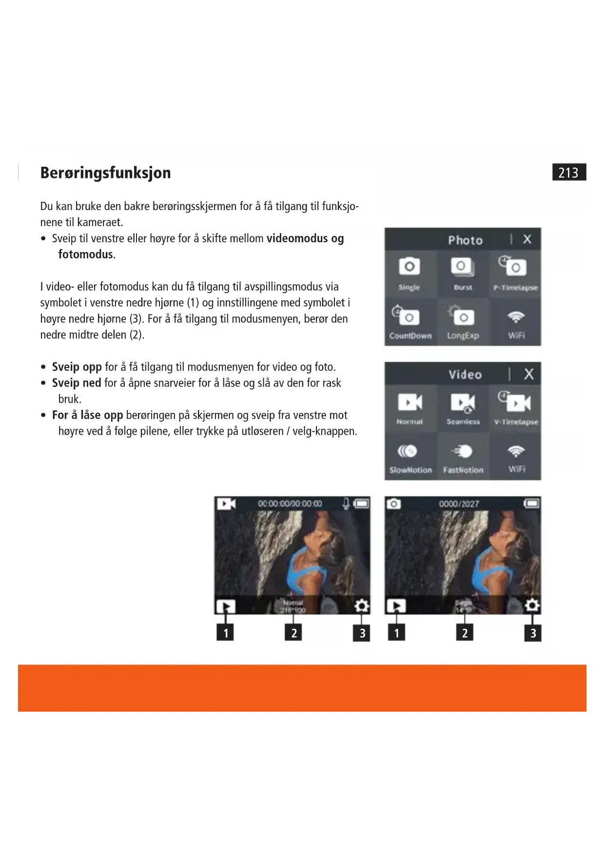 - Sveip til venstre eller høyre for å skifte mellom videomodus og fotomodus. I video- eller fotomodus kan du få tilgang til avspillingsmodus via symbolet i venstre nedre hjørne (1) og innstillingene med symbolet i høyre nedre hjørne (3). For å få tilgang til modusmenyen, berør den nedre midtre delen (2).