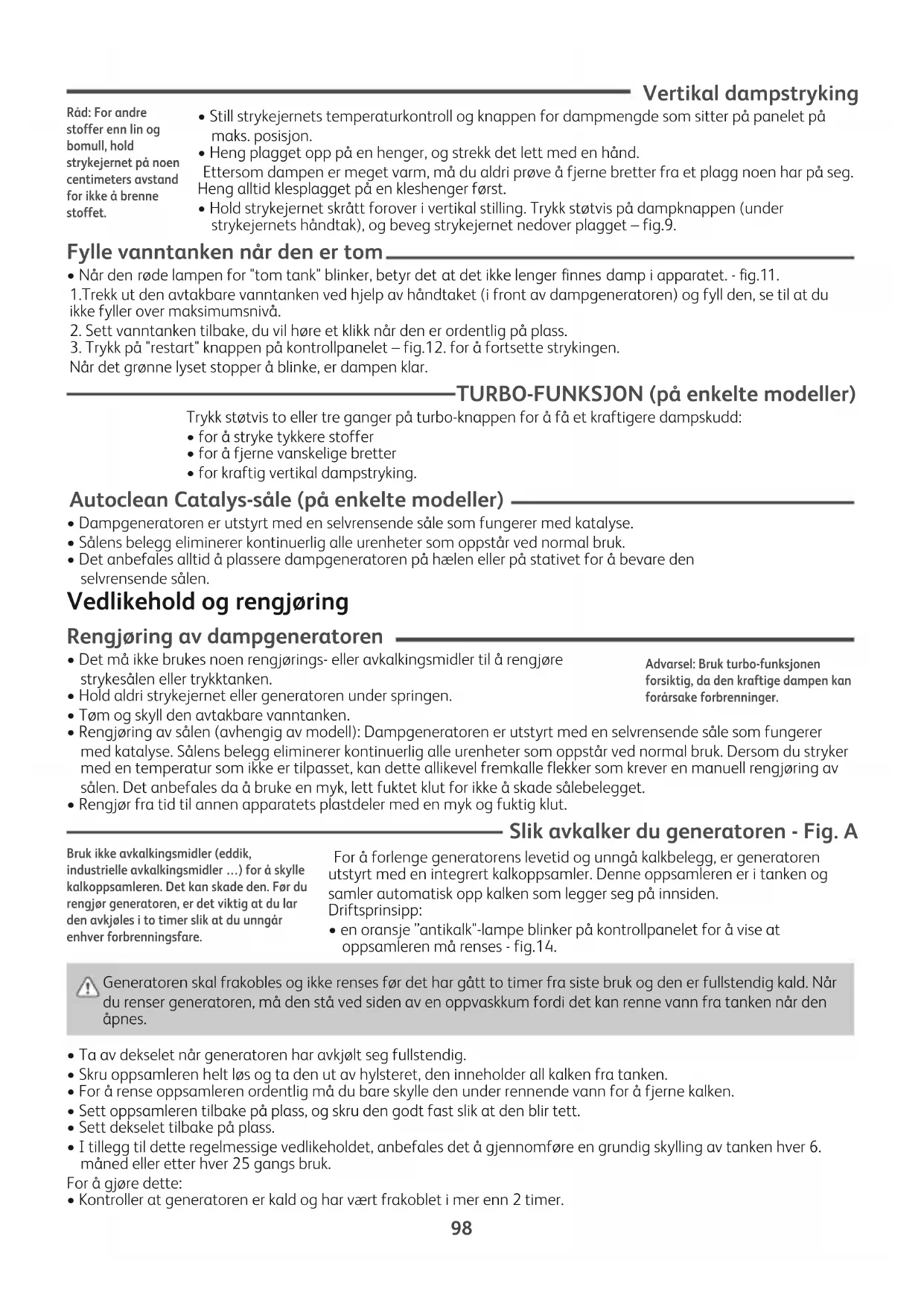 - Kontroller at generatoren er kald og har vært frakoblet i mer enn 2 timer. Råd: For andre stoffer enn lin og bomull, hold strykejernet på noen centimeters avstand for ikke å brenne stoffet. Advarsel: Bruk turbo-funksjonen forsiktig, da den kraftige dampen kan forårsake forbrenninger. Bruk ikke avkalkingsmidler (eddik, industrielle avkalkingsmidler …) for å skylle kalkoppsamleren. Det kan skade den. Før du rengjør generatoren, er det viktig at du lar den avkjøles i to timer slik at du unngår enhver forbrenningsfare. 1800133235 GV83XX-GV84XX E0_110x154 06/03/14 15:49 Page9899