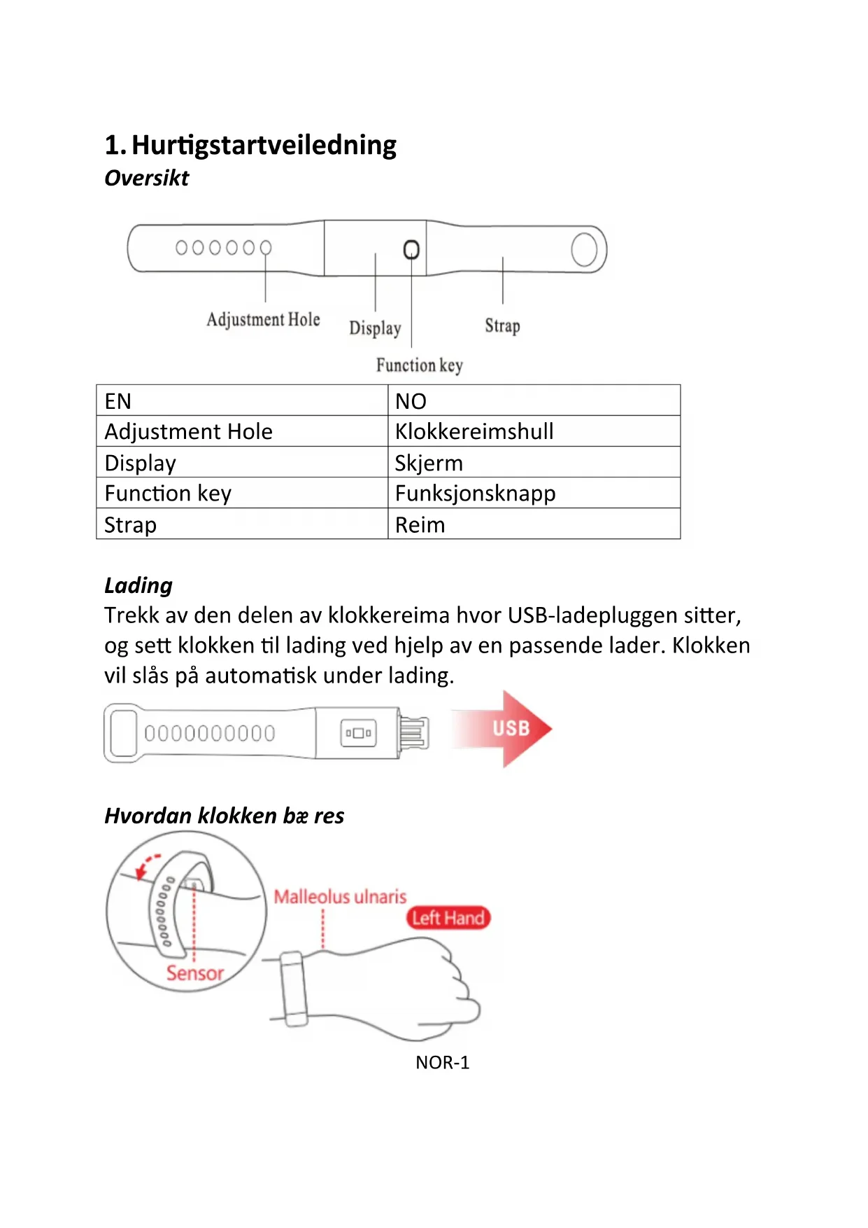 Lading Trekk av den delen av klokkereima hvor USB-ladepluggen sitter, og sett klokken til lading ved hjelp av en passende lader. Klokken vil slås på automatisk under lading.