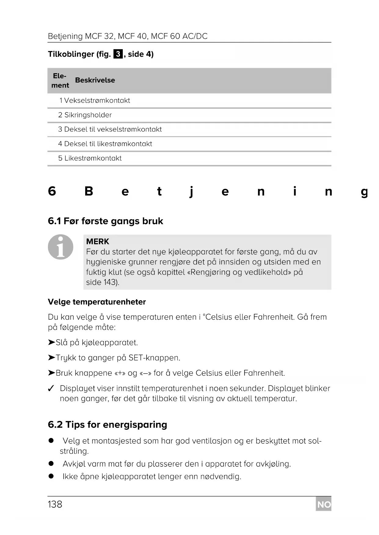 Velg et montasjested som har god ventilasjon og er beskyttet mot sol- stråling. Avkjøl varm mat før du plasserer den i apparatet for avkjøling. Ikke åpne kjøleapparatet lenger enn nødvendig. Ele- ment Beskrivelse1 Vekselstrømkontakt2 Sikringsholder3 Deksel til vekselstrømkontakt4 Deksel til likestrømkontakt5 Likestrømkontakt MERK Før du starter det nye kjøleapparatet for første gang, må du av hygieniske grunner rengjøre det på innsiden og utsiden med en fuktig klut (se også kapittel «Rengjøring og vedlikehold» på side 143). FR34-FR40-FR60_MCF32-MCF40-MCF60_OPM_EMEA16.book Seite 138 Donnerstag, 13. Februar 2020 3:51 15NO