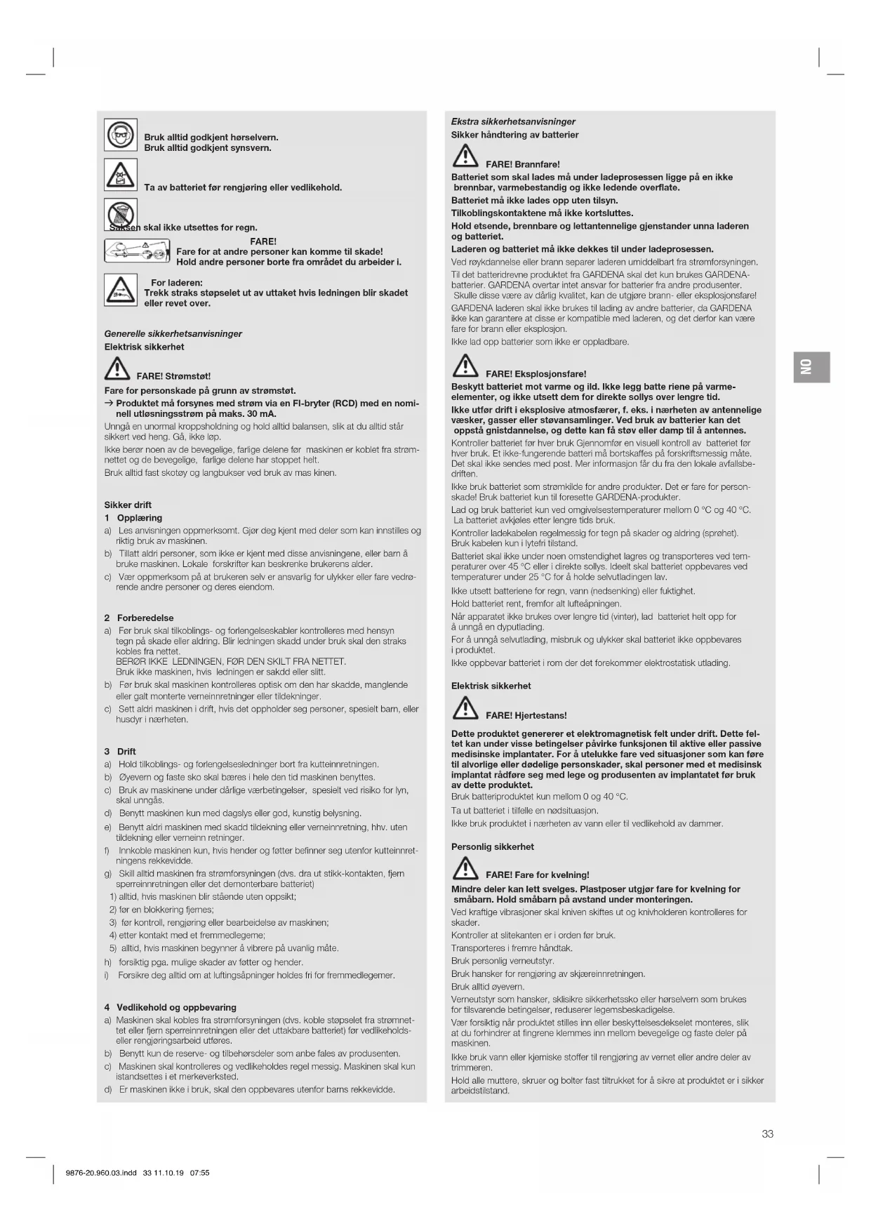 4 Vedlikehold og oppbevaring a) Maskinen skal kobles fra strømforsyningen (dvs. koble støpselet fra strømnet- tet eller fjern sperreinnretningen eller det uttakbare batteriet) før vedlikeholds- eller rengjøringsarbeid utføres. b) Benytt kun de reserve- og tilbehørsdeler som anbe fales av produsenten. c) Maskinen skal kontrolleres og vedlikeholdes regel messig. Maskinen skal kun istandsettes i et merkeverksted. d) Er maskinen ikke i bruk, skal den oppbevares utenfor barns rekkevidde. Ekstra sikkerhetsanvisninger Sikker håndtering av batterier FARE! Brannfare! Batteriet som skal lades må under ladeprosessen ligge på en ikke brennbar, varmebestandig og ikke ledende overflate. Batteriet må ikke lades opp uten tilsyn. Tilkoblingskontaktene må ikke kortsluttes. Hold etsende, brennbare og lettantennelige gjenstander unna laderen og batteriet. Laderen og batteriet må ikke dekkes til under ladeprosessen. Ved røykdannelse eller brann separer laderen umiddelbart fra strømforsyningen. Til det batteridrevne produktet fra GARDENA skal det kun brukes GARDENA- batterier. GARDENA overtar intet ansvar for batterier fra andre produsenter. Skulle disse være av dårlig kvalitet, kan de utgjøre brann- eller eksplosjonsfare! GARDENA laderen skal ikke brukes til lading av andre batterier, da GARDENA ikke kan garantere at disse er kompatible med laderen, og det derfor kan være fare for brann eller eksplosjon. Ikke lad opp batterier som ikke er oppladbare. FARE! Eksplosjonsfare! Beskytt batteriet mot varme og ild. Ikke legg batte riene på varme- elementer, og ikke utsett dem for direkte sollys over lengre tid. Ikke utfør drift i eksplosive atmosfærer, f. eks. i nærheten av antennelige væsker, gasser eller støvansamlinger. Ved bruk av batterier kan det oppstå gnistdannelse, og dette kan få støv eller damp til å antennes. Kontroller batteriet før hver bruk Gjennomfør en visuell kontroll av batteriet før hver bruk. Et ikke-fungerende batteri må bortskaffes på forskriftsmessig måte. Det skal ikke sendes med post. Mer informasjon får du fra den lokale avfallsbe- driften. Ikke bruk batteriet som strømkilde for andre produkter. Det er fare for person- skade! Bruk batteriet kun til foresette GARDENA-produkter. Lad og bruk batteriet kun ved omgivelsestemperaturer mellom 0 °C og 40 °C. La batteriet avkjøles etter lengre tids bruk. Kontroller ladekabelen regelmessig for tegn på skader og aldring (sprøhet). Bruk kabelen kun i lytefri tilstand. Batteriet skal ikke under noen omstendighet lagres og transporteres ved tem- peraturer over 45 °C eller i direkte sollys. Ideelt skal batteriet oppbevares ved temperaturer under 25 °C for å holde selvutladingen lav. Ikke utsett batteriene for regn, vann (nedsenking) eller fuktighet. Hold batteriet rent, fremfor alt lufteåpningen. Når apparatet ikke brukes over lengre tid (vinter), lad batteriet helt opp for å unngå en dyputlading. For å unngå selvutlading, misbruk og ulykker skal batteriet ikke oppbevares i produktet. Ikke oppbevar batteriet i rom der det forekommer elektrostatisk utlading. Elektrisk sikkerhet FARE! Hjertestans! Dette produktet genererer et elektromagnetisk felt under drift. Dette fel- tet kan under visse betingelser påvirke funksjonen til aktive eller passive medisinske implantater. For å utelukke fare ved situasjoner som kan føre til alvorlige eller dødelige personskader, skal personer med et medisinsk implantat rådføre seg med lege og produsenten av implantatet før bruk av dette produktet. Bruk batteriproduktet kun mellom 0 og 40 °C. Ta ut batteriet i tilfelle en nødsituasjon. Ikke bruk produktet i nærheten av vann eller til vedlikehold av dammer. Personlig sikkerhet FARE! Fare for kvelning! Mindre deler kan lett svelges. Plastposer utgjør fare for kvelning for småbarn. Hold småbarn på avstand under monteringen. Ved kraftige vibrasjoner skal kniven skiftes ut og knivholderen kontrolleres for skader. Kontroller at slitekanten er i orden før bruk. Transporteres i fremre håndtak. Bruk personlig verneutstyr. Bruk hansker for rengjøring av skjæreinnretningen. Bruk alltid øyevern. Verneutstyr som hansker, sklisikre sikkerhetssko eller hørselvern som brukes for tilsvarende betingelser, reduserer legemsbeskadigelse. Vær forsiktig når produktet stilles inn eller beskyttelsesdekselet monteres, slik at du forhindrer at fingrene klemmes inn mellom bevegelige og faste deler på maskinen. Ikke bruk vann eller kjemiske stoffer til rengjøring av vernet eller andre deler av trimmeren. Hold alle muttere, skruer og bolter fast tiltrukket for å sikre at produktet er i sikker arbeidstilstand. 9876-20.960.03.indd 33 11.10.19 07:55NO