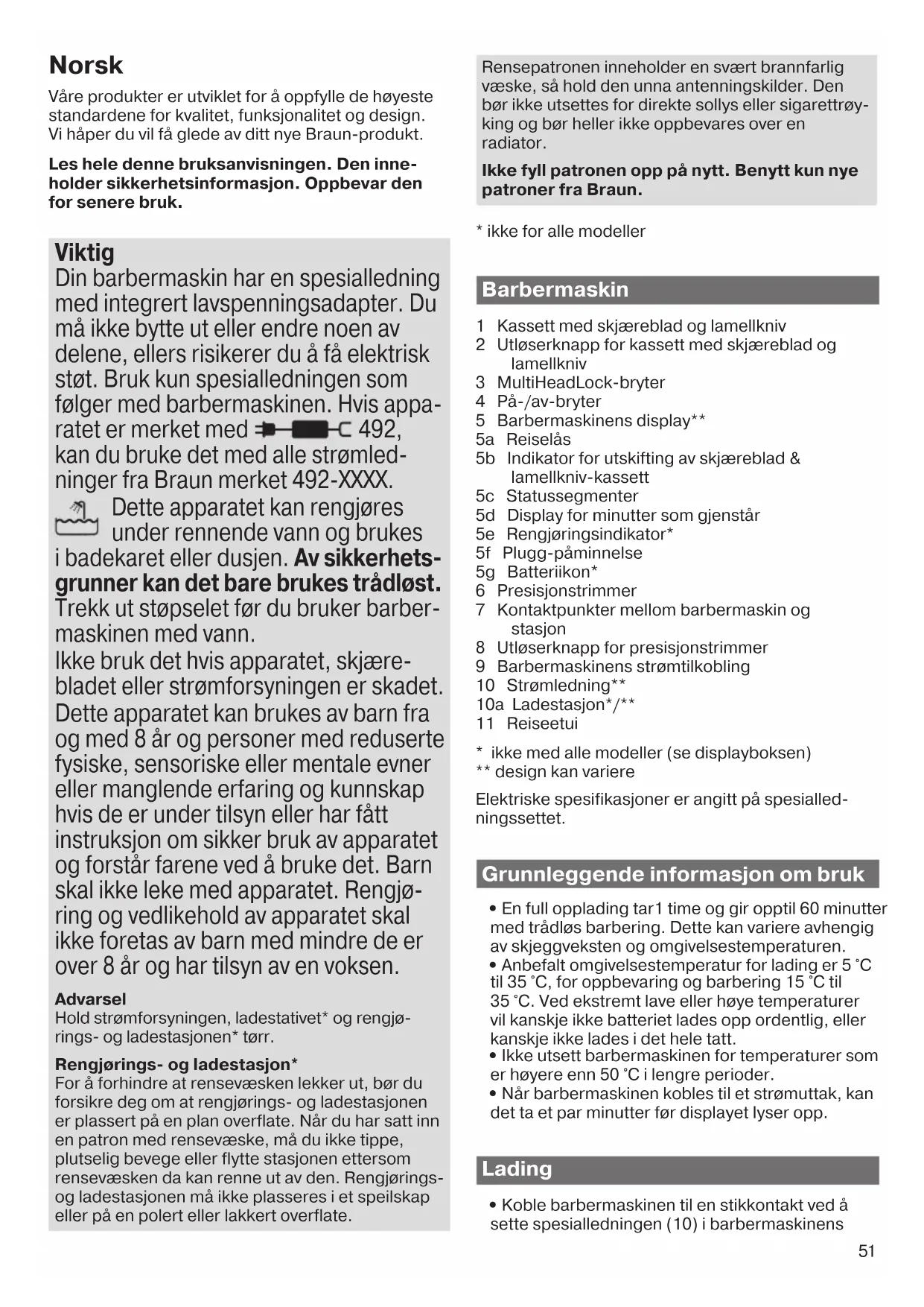 ette apparatet kan rengjøres under rennende vann og brukes i badekaret eller dusjen. Av sikkerhets- grunner kan det bare brukes trådløst. Trekk ut støpselet før du bruker barber- maskinen med vann. Ikke bruk det hvis apparatet, skjære- bladet eller strømforsyningen er skadet. Dette apparatet kan brukes av barn fra og med 8 år og personer med reduserte fysiske, sensoriske eller mentale evner eller manglende erfaring og kunnskap hvis de er under tilsyn eller har fått instruksjon om sikker bruk av apparatet og forstår farene ved å bruke det. Barn skal ikke leke med apparatet. Rengjø- ring og vedlikehold av apparatet skal ikke foretas av barn med mindre de er over 8 år og har tilsyn av en voksen. Advarsel Hold strømforsyningen, ladestativet* og rengjø- rings- og ladestasjonen* tørr. Rengjørings- og ladestasjon* For å forhindre at rensevæsken lekker ut, bør du forsikre deg om at rengjørings- og ladestasjonen er plassert på en plan overflate. Når du har satt inn en patron med rensevæske, må du ikke tippe, plutselig bevege eller flytte stasjonen ettersom rensevæsken da kan renne ut av den. Rengjørings- og ladestasjonen må ikke plasseres i et speilskap eller på en polert eller lakkert overflate. Rensepatronen inneholder en svært brannfarlig væske, så hold den unna antenningskilder. Den bør ikke utsettes for direkte sollys eller sigarettrøy- king og bør heller ikke oppbevares over en radiator. Ikke fyll patronen opp på nytt. Benytt kun nye patroner fra Braun.