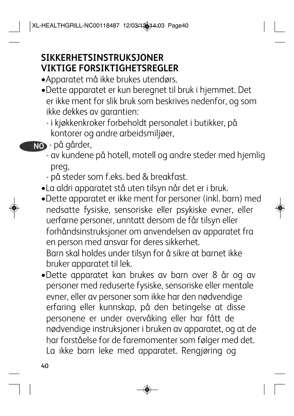 XL-HEALTHGRILL-NC00118487 12/03/13 14:03 Page40vedlikehold skal kun utføres av barn over 8 år som er under overvåking. La ikke apparatet og ledningen befinne seg innen rekkevidde for barn under 8 år.