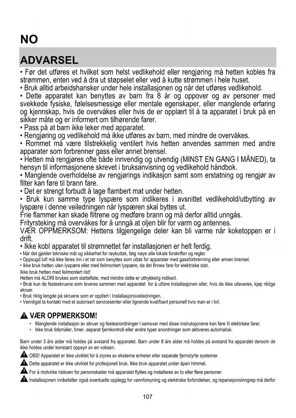 - Rommet må være tilstrekkelig ventilert hvis hetten anvendes sammen med andre apparater som forbrenner gass eller annet brensel.