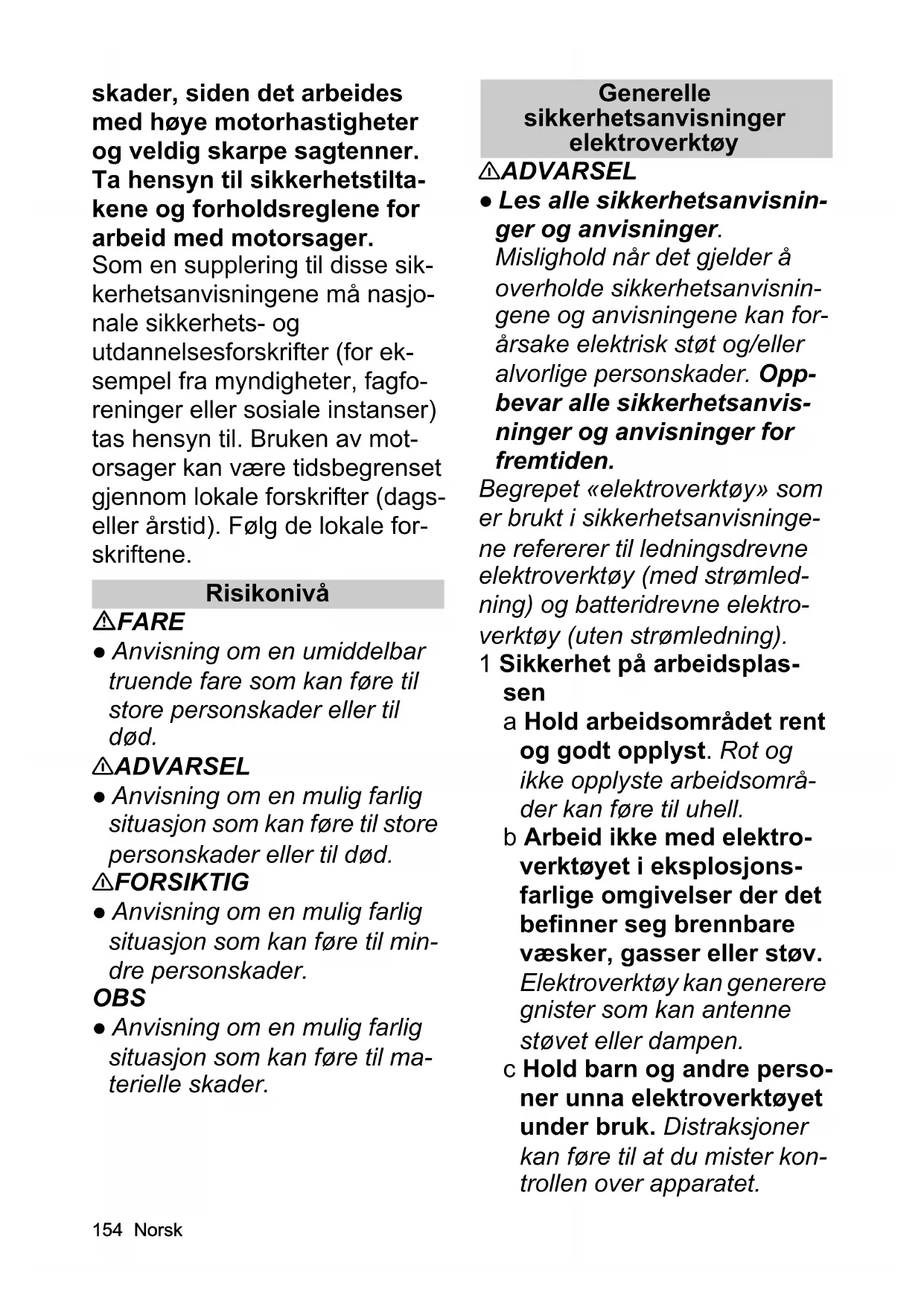 - EU-samsvarserklæring 54 Norsk skader, siden det arbeides med høye motorhastigheter og veldig skarpe sagtenner. Ta hensyn til sikkerhetstilta- kene og forholdsreglene for arbeid med motorsager. Som en supplering til disse sik- kerhetsanvisningene må nasjo- nale sikkerhets- og utdannelsesforskrifter (for ek- sempel fra myndigheter, fagfo- reninger eller sosiale instanser) tas hensyn til. Bruken av mot- orsager kan være tidsbegrenset gjennom lokale forskrifter (dags- eller årstid). Følg de lokale for- skriftene. Risikonivå FARE ● Anvisning om en umiddelbar truende fare som kan føre til store personskader eller til død. 몇 ADVARSEL ● Anvisning om en mulig farlig situasjon som kan føre til store personskader eller til død. 몇 FORSIKTIG ● Anvisning om en mulig farlig situasjon som kan føre til min- dre personskader. OBS ● Anvisning om en mulig farlig situasjon som kan føre til ma- terielle skader. Generelle sikkerhetsanvisninger elektroverktøy 몇 ADVARSEL ● Les alle sikkerhetsanvisnin- ger og anvisninger. Mislighold når det gjelder å overholde sikkerhetsanvisnin- gene og anvisningene kan for- årsake elektrisk støt og/eller alvorlige personskader. Opp- bevar alle sikkerhetsanvis- ninger og anvisninger for fremtiden. Begrepet «elektroverktøy» som er brukt i sikkerhetsanvisninge- ne refererer til ledningsdrevne elektroverktøy (med strømled- ning) og batteridrevne elektro- verktøy (uten strømledning). 1 Sikkerhet på arbeidsplas- sen a Hold arbeidsområdet rent og godt opplyst. Rot og ikke opplyste arbeidsområ- der kan føre til uhell. b Arbeid ikke med elektro- verktøyet i eksplosjons- farlige omgivelser der det befinner seg brennbare væsker, gasser eller støv. Elektroverktøy kan generere gnister som kan antenne støvet eller dampen. c Hold barn og andre perso- ner unna elektroverktøyet under bruk. Distraksjoner kan føre til at du mister kon- trollen over apparatet.Norsk 155 2 Elektrisk sikkerhet a Tilkoblingsstøpselet til elektroverktøyet må passe i stikkontakten. Støpselet skal ikke endres på noe vis. Ikke bruk adapter sammen med jordede elektroverktøy. Uforandre- de støpsler og egnede stik- kontakter reduserer risikoen for elektrisk støt. b Unngå kroppskontakt med jordede overflater som rør, varmeenheter, komfyrer og kjøleskap. Det er økt ri- siko for elektrisk støt hvis kroppen er jordet. c Hold elektroverktøy unna regn eller fuktighet. Hvis det trenger vann inn i elek- troverktøy, økes risikoen for elektrisk støt. d Ikke misbruk ledningen til å bære eller henge opp en- heten eller trekke ut støp- selet fra stikkontakten. Hold ledningen unna var- me, olje, skarpe kanter el- ler bevegelige apparatdeler. Skadde eller viklede tilkoblingsledninger øker risikoen for elektrisk støt. e Hvis du arbeider med elek- troverktøy utendørs, må du kun bruke skjøtelednin- ger som er egnet for bruk utendørs. Bruk av skjøte- ledninger egnet for bruk utendørs reduserer risikoen for elektrisk støt. f Hvis det ikke kan unngås at elektroverktøyet brukes i fuktige omgivelser, må du bruke en jordfeilbryter. Bruk av jordfeilbryter redu- serer risikoen for elektrisk støt. 3 Personers sikkerhet a Vær oppmerksom, følg med på hva du gjør, og vær fornuftig i arbeidet med et elektroverktøy. Ikke bruk et elektroverktøy dersom du er trøtt eller på- virket av narkotiske mid- ler, alkohol eller medikamenter. Et øye- blikks uoppmerksomhet ved bruken av det elektroverktøy kan føre til alvorlige skader. b Bruk personlig verneut- styr, og bruk alltid verne- briller. Bruk av personlig verneutstyr, som støvmas- ke, sklisikre sikkerhetssko, beskyttelseshjelm eller hørselsvern, alt etter type bruk av elektroverktøyet, re- duserer risikoen for skader. c Unngå utilsiktet igangset- ting. Sørg for at elektro- verktøyet er slått av før du kobler det til strømforsy- ningen og/eller kobler til batteriet, tar det ut eller bærer det. Hvis du har fin- geren på bryteren når du156 Norsk bærer elektroverktøyet eller det er koblet til strømforsy- ningen, kan det føre til ulyk- ker. d Fjern innstillingsverktøy eller skrujern før du slår på elektroverktøyet. Et verktøy eller en nøkkel som befinner seg i en roterende apparatdel, kan føre til per- sonskader. e Unngå en unormal kropps- holdning. Sørg for å stå sikkert og hold likevekten til enhver tid. Da kan du kontrollere elektroverktøyet bedre i uventede situasjo- ner. f Bruk egnede klær. Ikke bruk romslige klær eller smykker. Hold hår, klær og hansker unna deler som beveger seg. Løstsittende klær, hansker, smykker eller langt hår kan trekkes inn av deler som beveger seg. g Hvis det kan monteres støvavtrekk og -oppsam- lingsinnretninger, må du påse at disse er koblet til og brukes riktig. Bruk av støvavtrekk kan redusere fa- rer fra støv. 4 Bruk og behandling av elek- troverktøy a Ikke overbelast apparatet. Bruk riktig elektroverktøy for arbeidet. Med egnet elektroverktøy arbeider du bedre og sikrere i det angitte ytelsesområdet. b Ikke bruk elektroverktøy med defekt bryter. Et elek- troverktøy som ikke lenger kan slås på eller av, er farlig og må repareres. c Trekk støpselet ut av stik- kontakten og/eller fjern batteriet før du foretar ap- paratinnstillinger, skifter tilbehørsdeler eller legger bort apparatet. Disse for- siktighetstiltakene forhin- drer utilsiktet oppstart av elektroverktøyet. d Oppbevar elektroverktøy som ikke er i bruk utenfor barns rekkevidde. Ikke la personer bruke apparatet hvis de ikke er kjent med det eller har lest denne bruksanvisningen. Elektro- verktøy er farlige hvis de brukes av uerfarne perso- ner. e Stell nøye med elektro- verktøyet. Kontroller at be- vegelige deler fungerer uten problemer og ikke sit- ter i klem, om deler er brukket eller ødelagt, eller så skadet at elektroverk- tøyets funksjon påvirkes. Få skadde deler reparert før apparatet brukes igjen. Mange ulykker skyldes dår- lig vedlikeholdt elektroverk- 