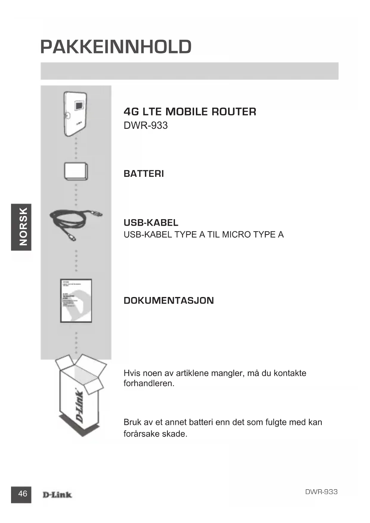 Du kan trykke på av/på-knappen for å gå gjennom de ulike skjermene til navnet på det trådløse nettverket (SSID) og passordet (KEY) vises. Vær oppmerksom på at det trådløse 2,4 GHz-nettverket (2,4 G) og det trådløse 5 GHz-nettverket (5 G) kongureres hver for seg. I tillegg kan du bruke WPS til å koble andre WPS-støttede enheter til det trådløse nettverket uten å oppgi SSID eller passord. Innled WPS- paring på enheten din og hold inne WPS-knappen på DWR-933 til WPS- ikonet vises på skjermen. Enheten din vil deretter automatisk koble til det trådløse nettverket ditt. Til slutt kan du tilbakestille til standardinnstillingene ved å føre inn et langt og tynt verktøy, f.eks. en utbrettet binders, i tilbakestillingsknappen under batteridekselet. Hold inn i ti sekunder og slipp for å tilbakestille til standardinnstillingene. SSID-en din og passordet ditt blir tilbakestilt til fabrikkstandardene.51 DWR-933 DANSK PAKKENS INDHOLD 4G LTE MObILE ROuTER DWR-933 bATTERI uSb-KAbEL