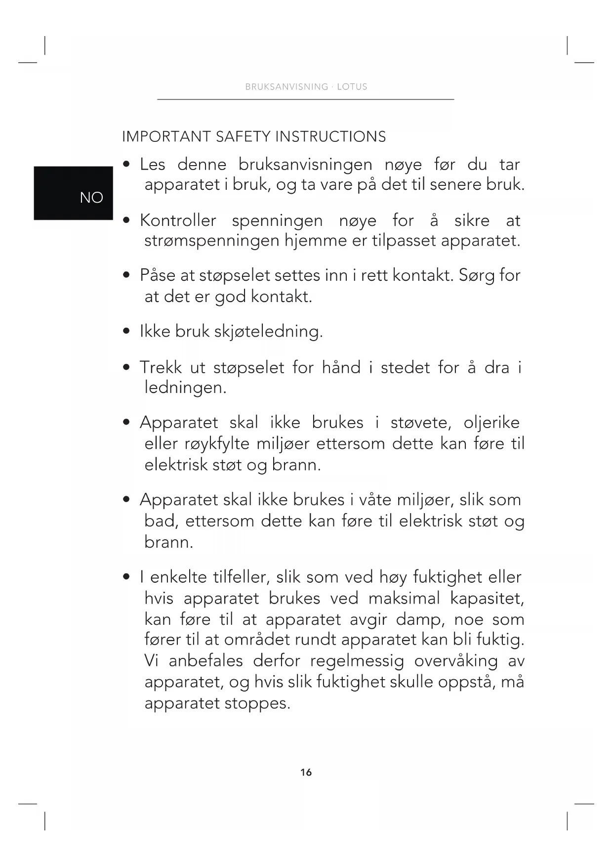 - Apparatet skal ikke brukes i våte miljøer, slik som bad, ettersom dette kan føre til elektrisk støt og brann.