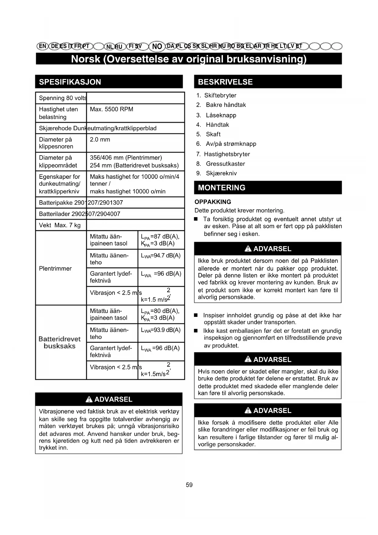 ADVARSEL For å hindre utilsiktet start som kan forårsake al- vorlige personskade, alltid ta ut batteripakken fra produkt når du monterer delene. Å SETTE PÅ FREMRE HÅNDTAK Se Figur 2. ADVARSEL Unngå kontakt med kniven Kontakt med kniven kan føre til alvorlig personskade. Snu snorklipperen for å få tilgang til klippehodet. Plasser skjermen (b) på klippehodet og skyv skjermen inn på klippehodet ved å følge sporet i klippehodet. Tilpass skruehullene i skjermen til skruehullene i klippehodet. Sett skruene inn i klippehodet og fest skjermen. Plasser skjermlokket (c) på skjermen og skyv skjermlokket inn på skjermen. Tilpass skruehullene i skjermlokket til skruehullene i skjermen. Sett skruene inn i skjermen og fest skjermlokket på plass. ADVARSEL Ikke la fortrolighet med dette produktet gjøre deg uforsiktig. Husk at uforsiktighet i løpet av et brøkdel av et sekund er nok til å volde alvorlig personskade. ADVARSEL Bruk alltid vernebriller eller sikkerhetsglass med sidevern når du bruker elektroverktøy. Hvis du ikke gjør dette kan det resultere i gjenstander blir kastet i øynene dine som kan resultere i mulig alvorlige skader. ADVARSEL Ikke bruk tilkoblet utstyr eller tilbehør som ikke er an- befalt av produsenten av dette verktøyet. Bruken av tilkoblet utstyr eller tilbehør som ikke er anbefalt kan føre til alvorlig personskade. FOR Å FESTE DET HÅNDTAKET Se Figur 3. Skru ut knotten i midten 'A', fjern hetten 'B' og i det nedre setet 'C', mens man forsikrer seg pm at fjæren sitter i setet sitt. Plasser styret i den nedre støtten og sett inn støttepluggen 'D' i forhullingen på styret 'E'. Hekt på hetten 'B' til den nedre støtten 'C' og plasser hele blokken i setet på drivstangen. Drei styret til den mest komfortable arbeidsposisjonen, og blokker det med knotten 'A'. DRIFT Hold produktet med høyre hånd på avtrekkerhåndtaket og venstre hånd på venstre håndtak. Hold et fast grep med begge hender når redskapen brukes. Trimmeren skal holdes i en komfortabel posisjon, med det bakre håndtaket i ca. hoftehøyde. Bruk alltid produktet på full gass. Hvis avklippet vegetasjon eller søppel legger seg rundt klippeutstyret må AVTREKKEREN FRIGJØRES og vegetasjonen og søppel fjernes. Benytt selen når produktet brukes. INSTALLASJON AV BATTERIPAKKEN Se Figur 4. Plasser batteripakken i klipperen. Tilpass de hevede ribbene i batteripakken til sporene i klipperens batteriport. Påse at låsehakene på begge sider av batteripakken er i inngrep og at batteripakken er sikret i laderen før lading påbegynnes. FJERNING AV BATTERIPAKKEN Se Figur 4. Frigjør skiftebryteren og låseutløseren for å stoppe klipperen. Trykk strømbryteren for å slå av klipperen. Trykk inn og hold batterihakeknappen på bunnen av batteripakken. Fjern batteripakken fra trimmeren. START/STOPP AV KLIPPEREN Se Figur 5. For å starte: Trykk inn på/av-bryteren Trykk inn låseknappen og dernest avtrekkeren. Trykk inn høyhastighetsknappen for å øke hastigheten avhengig av tilstanden på gresset. To LED-lys vil tennes over høyhastighetsknappen og viser at klipperen er i høyhastighetsinnstilling. For å stoppe: Løs ut avtrekkeren.Norsk (Oversettelse av original bruksanvisning)