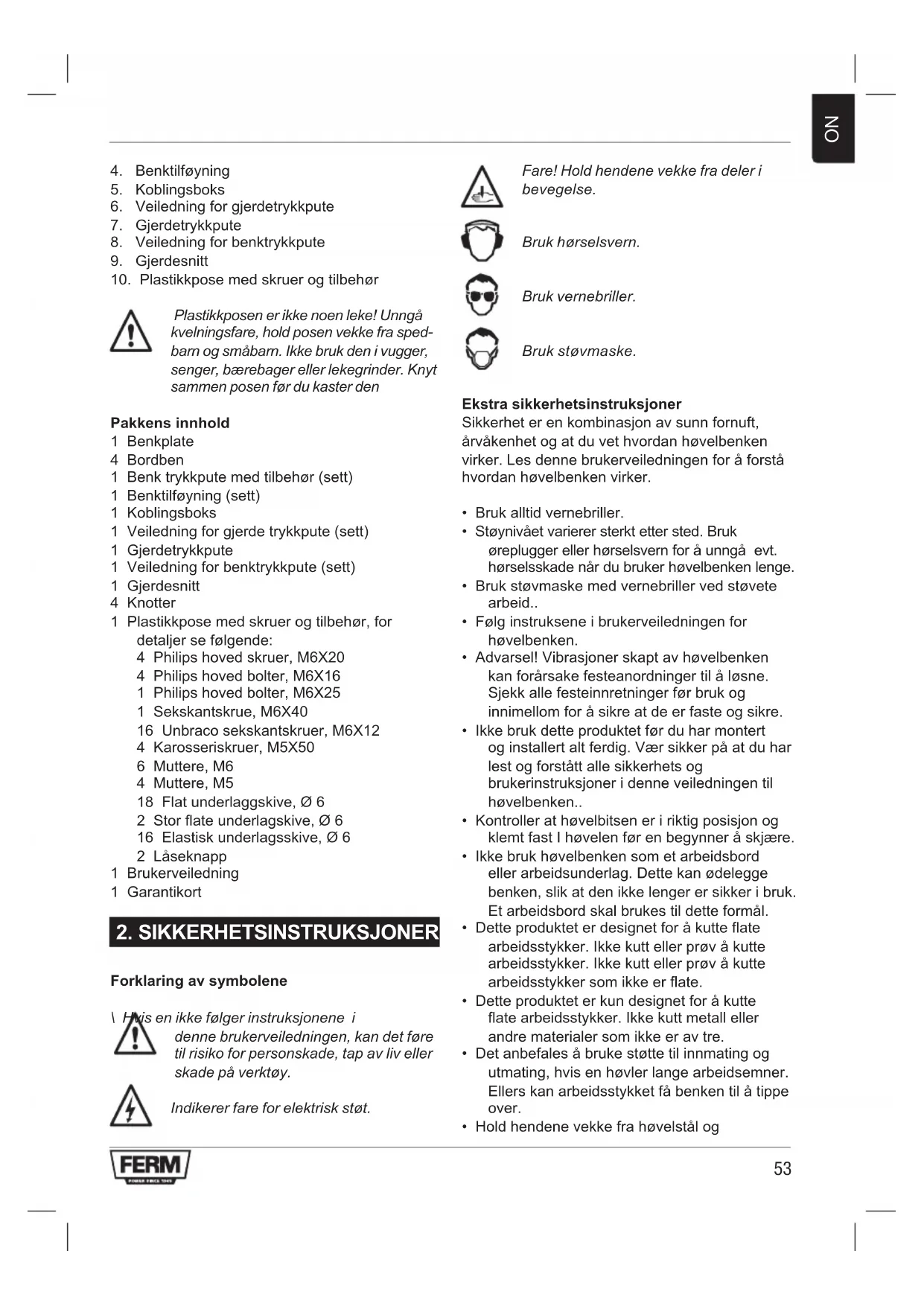 - Ikke bruk dette produktet før du har montert og installert alt ferdig. Vær sikker på at du har lest og forstått alle sikkerhets og brukerinstruksjoner i denne veiledningen til høvelbenken..