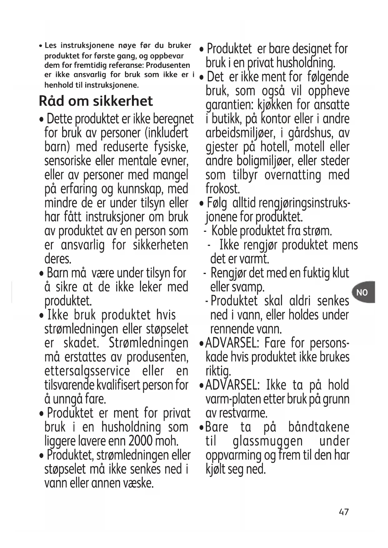- Bare ta på båndtakene til glassmuggen under oppvarming og frem til den har kjølt seg ned. NO• Dette produktet kan brukes av barn som er minst åtte år, forutsatt at de er under oppsyn, at de har fått instruksjoner om sikker bruk av produktet og at de er fullt klar over farene som er involvert. Rengjøring og vedlikehold skal ikke utføres av barn med mindre de er minst åtte år og er under oppsyn av en voksen.