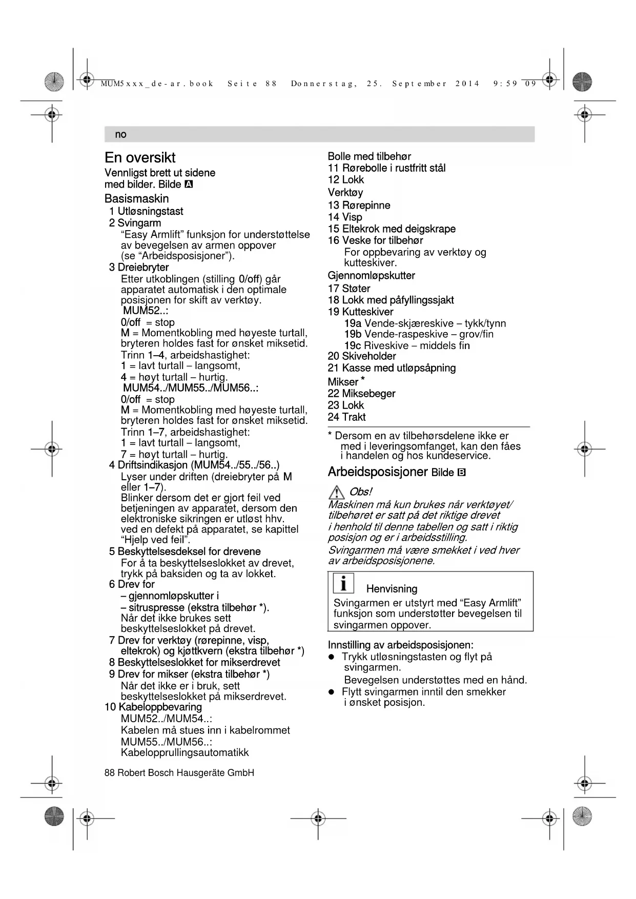 - Ændringer forbeholdes. MUM5xxx_de-ar.book Seite 84 Donnerstag, 25. September 2014 9:59 0985Robert Bosch Hausgeräte GmbH 85 Innhold Аor din egen sikkerhet p. 85