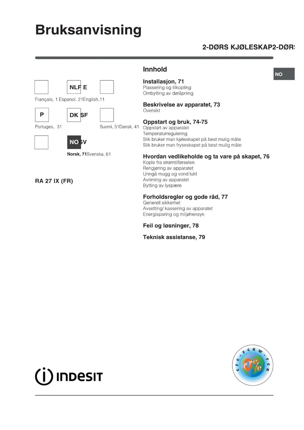 Innhold Installasjon, 71 Plassering og tilkopling Ombytting av døråpning Beskrivelse av apparatet, 73 Oversikt Oppstart og bruk, 74-75 Oppstart av apparatet Temperaturregulering Slik bruker man kjøleskapet på best mulig måte Slik bruker man fryseskapet på best mulig måte Hvordan vedlikeholde og ta vare på skapet, 76 Kople fra strømtilførselen Rengjøring av apparatet Unngå mugg og vond lukt Avriming av apparatet Bytting av lyspære Forholdsregler og gode råd, 77 Generell sikkerhet Avsetting/ kassering av apparatet Energisparing og miljøhensyn Feil og løsninger, 78 Teknisk assistanse, 79 Bruksanvisning RA 27 IX (FR) Français, 1 Espanol, 21English,11 NLF E Portuges,