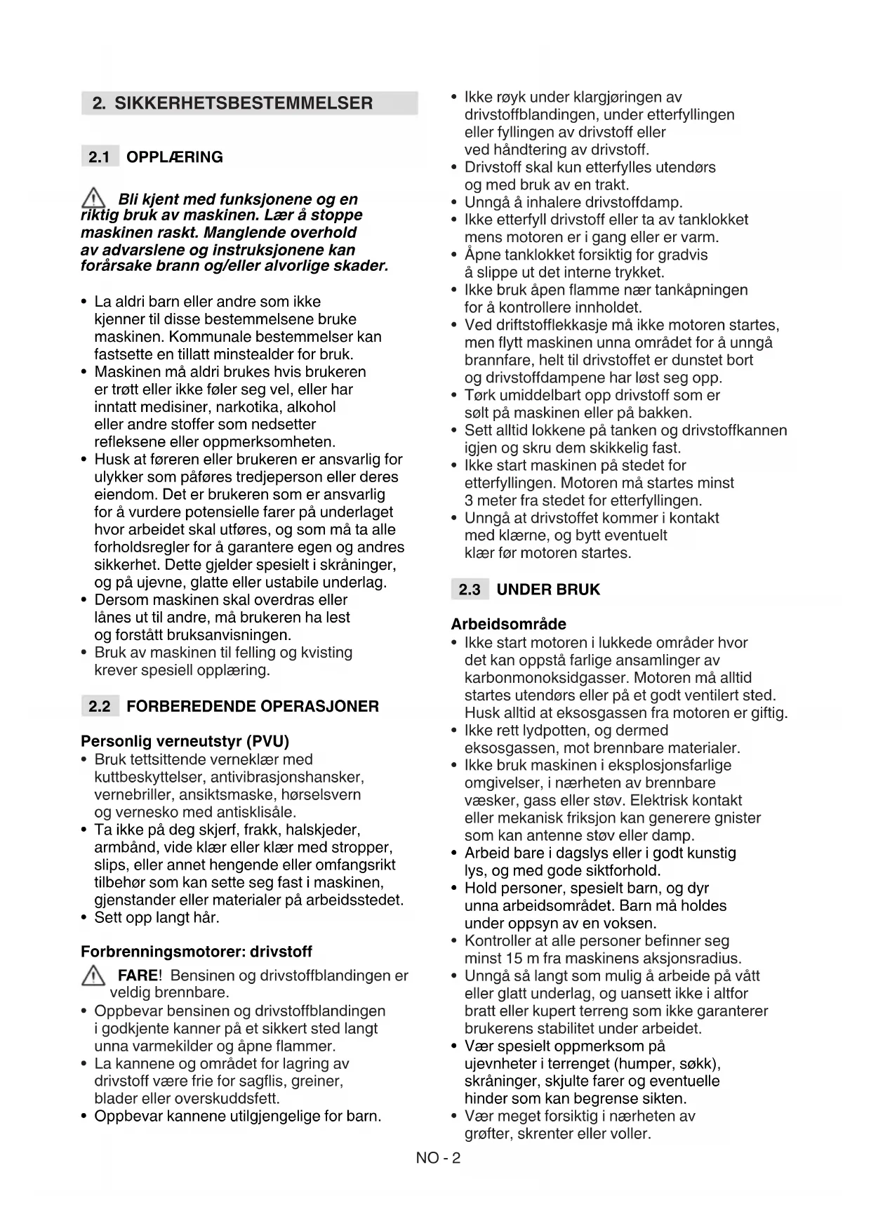 - Ved driftstoekkasje må ikke motoren startes, men ytt maskinen unna området for å unngå brannfare, helt til drivstoet er dunstet bort og drivstodampene har løst seg opp.
