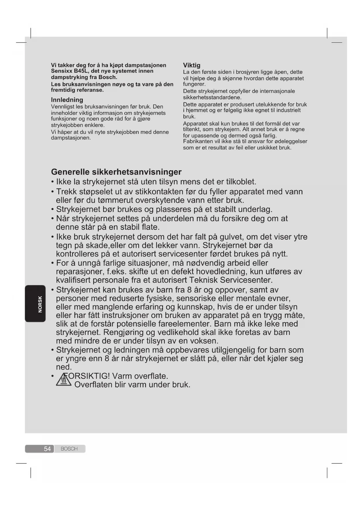- Tryk på knappen igen, og strygejernet holder straks op med at dampe. Hvis ovenstående ikke løser problemet, skal du kontakte autoriseret teknisk service. DukanhentevejledningenunderBosch‘lokalehjemmesider.54 B O S C H NORSK Vitakkerdegforåhakjøptdampstasjonen SensixxB45L,detnyesystemetinnen dampstrykingfraBosch. Lesbruksanvisningennøyeogtavarepåden fremtidigreferanse. Innledning Vennligst les bruksanvisningen før bruk. Den inneholder viktig informasjon om strykejernets funksjoner og noen gode råd for å gjøre strykejobben enklere. Vi håper at du vil nyte strykejobben med denne dampstasjonen. Viktig La den første siden i brosjyren ligge åpen, dette vil hjelpe deg å skjønne hvordan dette apparatet fungerer. Dette strykejernet oppfyller de internasjonale sikkerhetsstandardene. Dette apparatet er produsert utelukkende for bruk i hjemmet og er følgelig ikke egnet til industrielt bruk. Apparatet skal kun brukes til det formål det var tiltenkt, som strykejern. Alt annet bruk er å regne for upassende og dermed også farlig. Fabrikanten vil ikke stå til ansvar for ødeleggelser som er et resultat av feil eller uskikket bruk. Generellesikkerhetsanvisninger