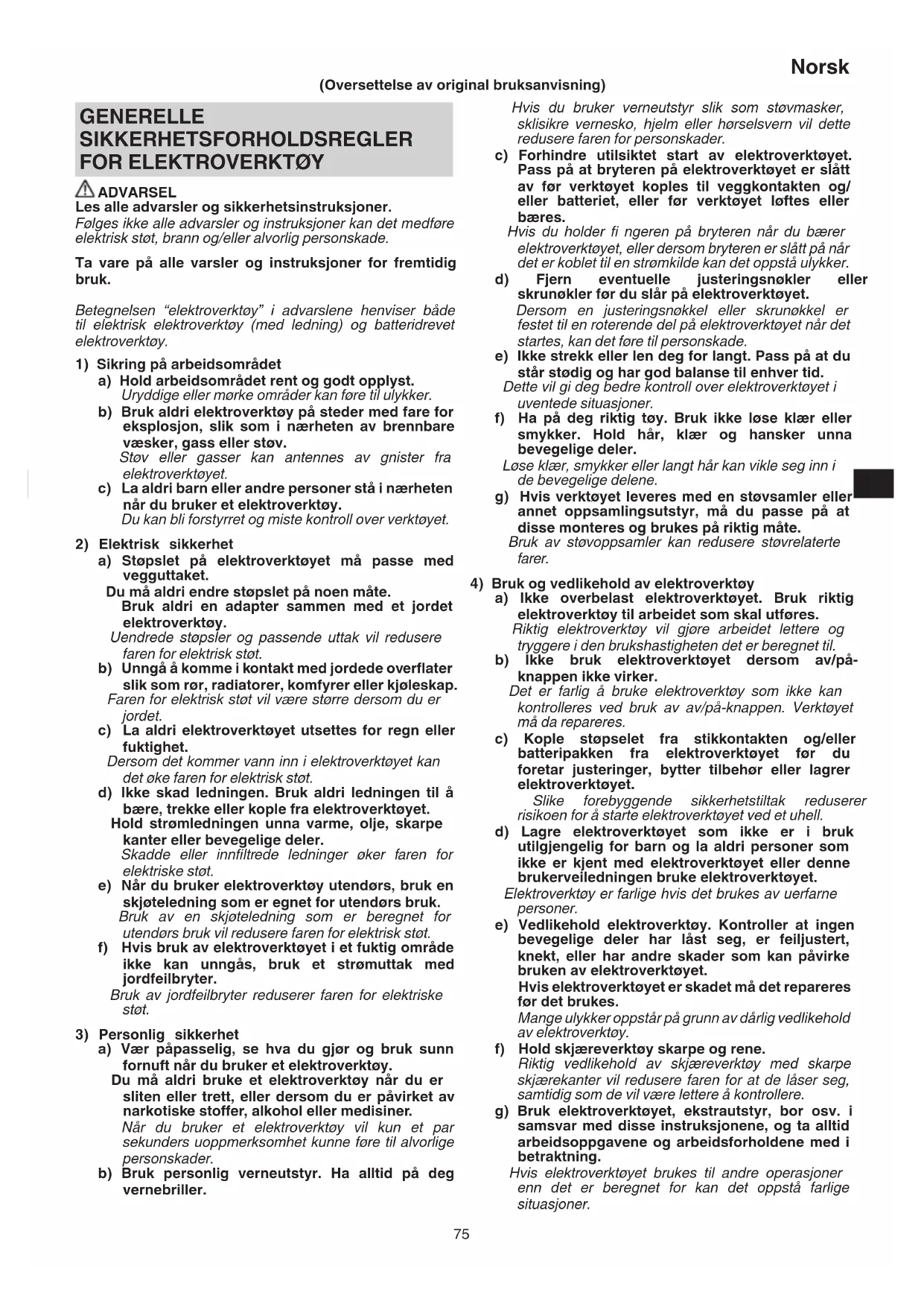 ADVARSEL Les alle advarsler og sikkerhetsinstruksjoner. Følges ikke alle advarsler og instruksjoner kan det medføre elektrisk støt, brann og/eller alvorlig personskade. Ta vare på alle varsler og instruksjoner for fremtidig bruk. Betegnelsen “elektroverktøy” i advarslene henviser både til elektrisk elektroverktøy (med ledning) og batteridrevet elektroverktøy.