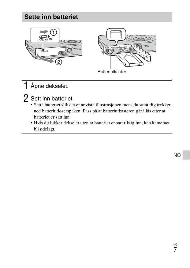 - Hvis du lukker dekselet uten at batteriet er satt riktig inn, kan kameraet bli ødelagt.