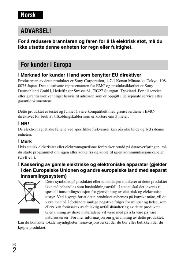 Norsk ADVARSEL! For å redusere brannfaren og faren for å få elektrisk støt, må du ikke utsette denne enheten for regn eller fuktighet. For kunder i Europa [ Merknad for kunder i land som benytter EU direktiver Produsenten av dette produktet er Sony Corporation, 1-7-1 Konan Minato-ku Tokyo, 1080075 Japan. Den autoriserte representanten for EMC og produktsikkerhet er Sony Deutschland GmbH, Hedelfinger Strasse 61, 70327 Stuttgart, Tyskland. For all service eller garantisaker vennligst henvis til adressen som er oppgitt i de separate service eller garantidokumentene. Dette produktet er testet og funnet å være kompatibelt med grenseverdiene i EMCdirektivet for bruk av tilkoblingskabler som er kortere enn 3 meter. [ NB! De elektromagnetiske feltene ved spesifikke frekvenser kan påvirke bilde og lyd i denne enheten. [ Merk Hvis statisk elektrisitet eller elektromagnetisme forårsaker brudd på dataoverføringen, må du starte programmet om igjen eller koble fra og koble til igjen kommunikasjonskabelen (USB e.l.). [ Kassering av gamle elektriske og elektroniske apparater (gjelder i den Europeiske Unionen og andre europeiske land med separat innsamlingssystem) Dette symbolet på produktet eller emballasjen indikerer at dette produktet ikke må behandles som husholdningsavfall. I stedet skal det leveres til spesiell innsamlingsstasjon for gjenvinning av elektrisk og elektronisk utstyr. Ved å sørge for at dette produktet avhentes på korrekt måte, vil du være med på å forhindre mulige negative følger for miljøet og helse, som ellers kan forårsakes av feilaktig avfallshåndtering av dette produktet. Gjenvinning av disse materialene vil være med på å ta vare på våre naturressurser. For mer informasjon om gjenvinning av dette produktet, kan du kontakte lokale myndigheter, renovasjonsverket der du bor eller butikken der du kjøpte produktet.