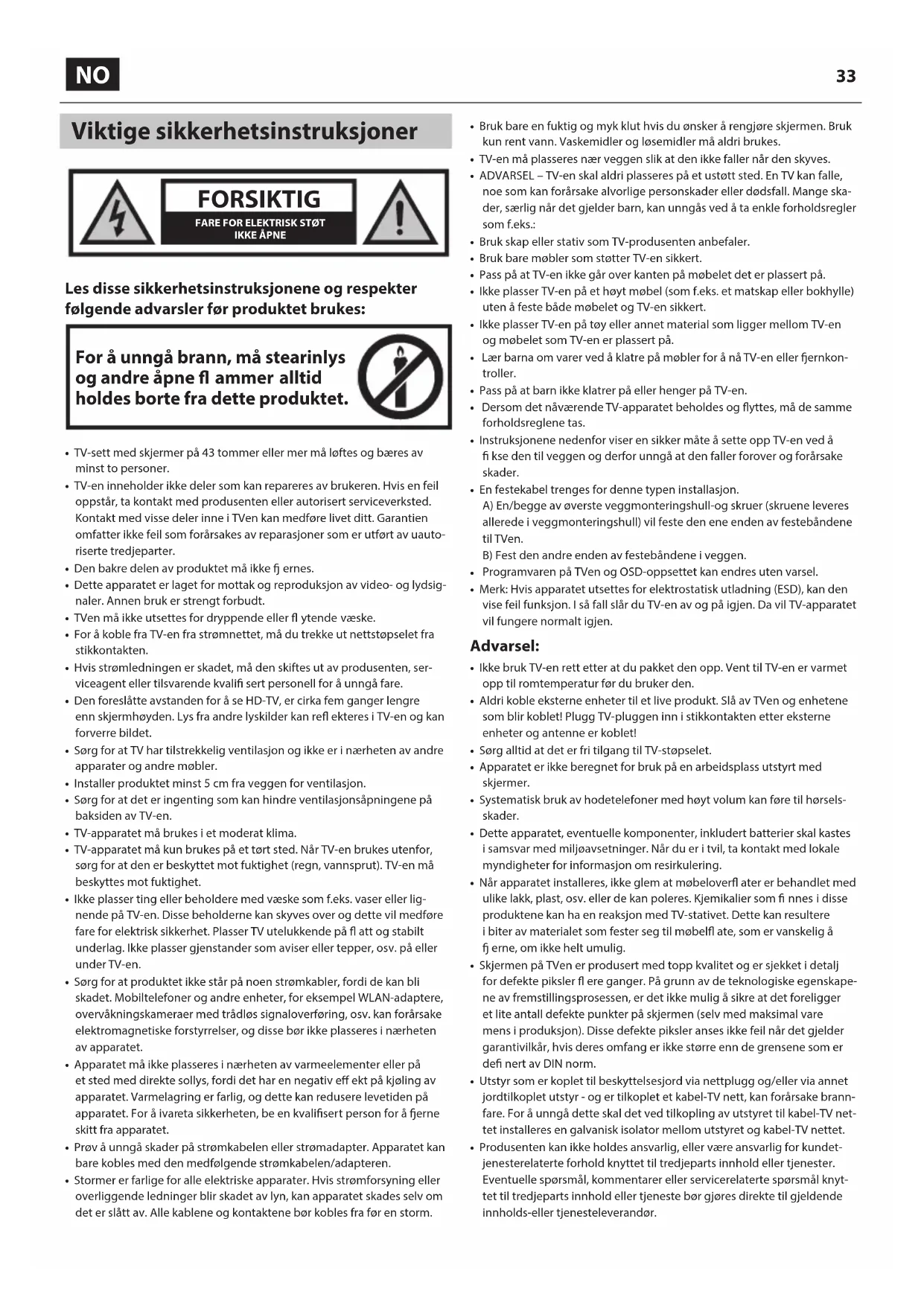 - ADVARSEL – TV-en skal aldri plasseres på et ustøtt sted. En TV kan falle, noe som kan forårsake alvorlige personskader eller dødsfall. Mange ska- der, særlig når det gjelder barn, kan unngås ved å ta enkle forholdsregler som f.eks.:
