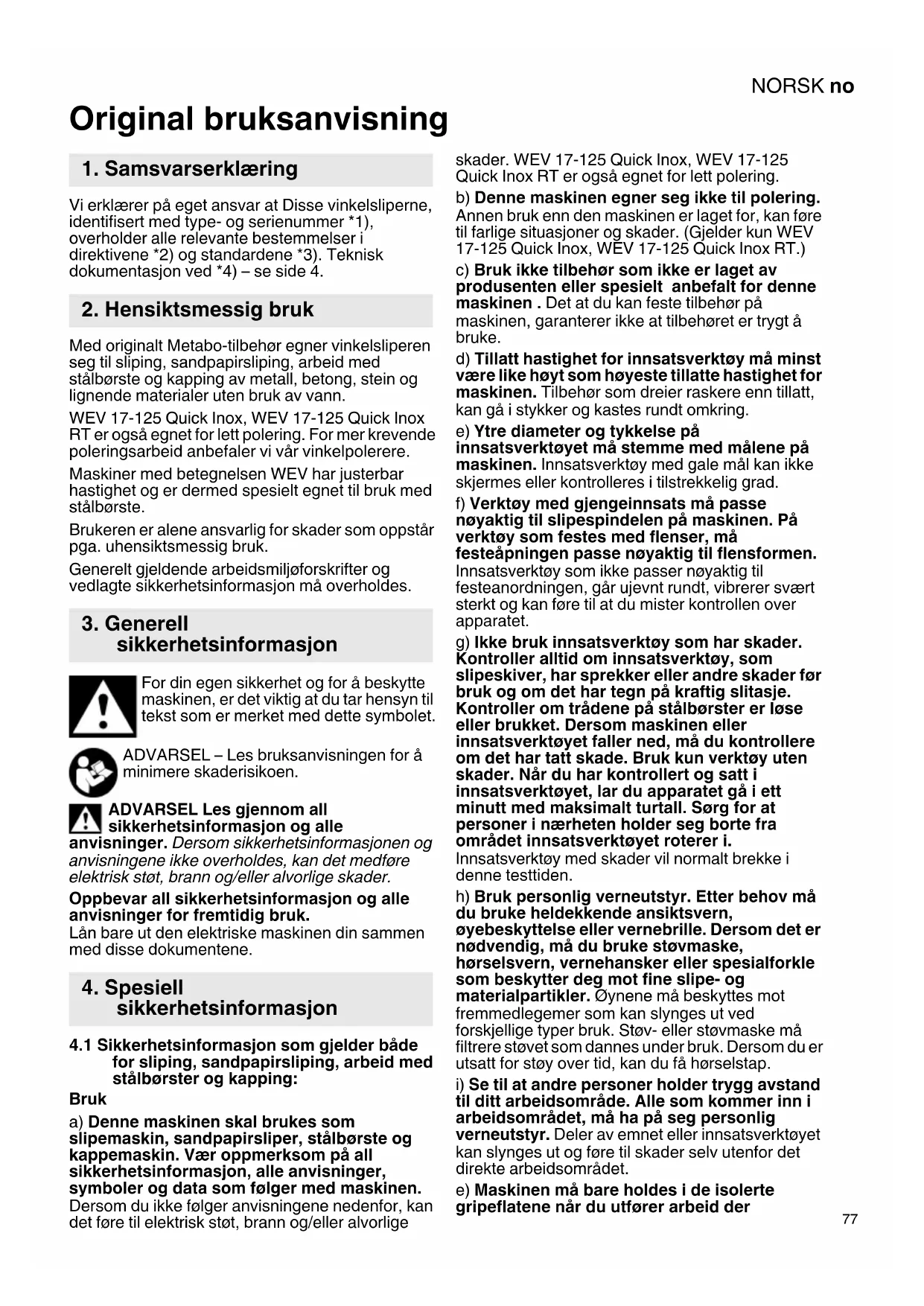 Original bruksanvisning Vi erklærer på eget ansvar at Disse vinkelsliperne, identifisert med type- og serienummer *1), overholder alle relevante bestemmelser i direktivene *2) og standardene *3). Teknisk dokumentasjon ved *4) – se side 4. Med originalt Metabo-tilbehør egner vinkelsliperen seg til sliping, sandpapirsliping, arbeid med stålbørste og kapping av metall, betong, stein og lignende materialer uten bruk av vann. WEV 17-125 Quick Inox, WEV 17-125 Quick Inox RT er også egnet for lett polering. For mer krevende poleringsarbeid anbefaler vi vår vinkelpolerere. Maskiner med betegnelsen WEV har justerbar hastighet og er dermed spesielt egnet til bruk med stålbørste. Brukeren er alene ansvarlig for skader som oppstår pga. uhensiktsmessig bruk. Generelt gjeldende arbeidsmiljøforskrifter og vedlagte sikkerhetsinformasjon må overholdes. For din egen sikkerhet og for å beskytte maskinen, er det viktig at du tar hensyn til tekst som er merket med dette symbolet. ADVARSEL – Les bruksanvisningen for å minimere skaderisikoen. ADVARSEL Les gjennom all sikkerhetsinformasjon og alle anvisninger. Dersom sikkerhetsinformasjonen og anvisningene ikke overholdes, kan det medføre elektrisk støt, brann og/eller alvorlige skader. Oppbevar all sikkerhetsinformasjon og alle anvisninger for fremtidig bruk. Lån bare ut den elektriske maskinen din sammen med disse dokumentene.