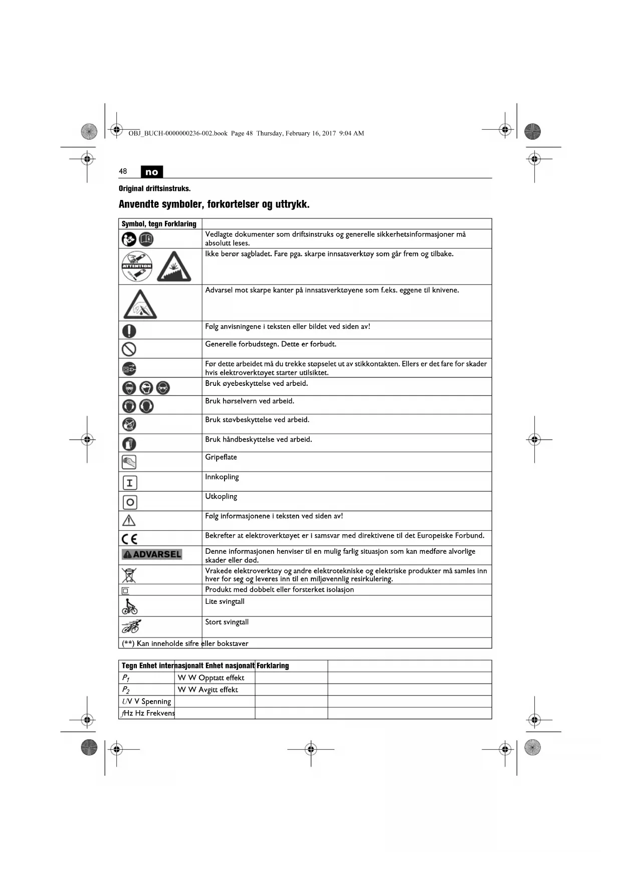 Original driftsinstruks. Anvendte symboler, forkortelser og uttrykk. Symbol, tegn Forklaring Vedlagte dokumenter som driftsinstruks og generelle sikkerhetsinformasjoner må absolutt leses. Ikke berør sagbladet. Fare pga. skarpe innsatsverktøy som går frem og tilbake. Advarsel mot skarpe kanter på innsatsverktøyene som f.eks. eggene til knivene. Følg anvisningene i teksten eller bildet ved siden av! Generelle forbudstegn. Dette er forbudt. Før dette arbeidet må du trekke støpselet ut av stikkontakten. Ellers er det fare for skader hvis elektroverktøyet starter utilsiktet. Bruk øyebeskyttelse ved arbeid. Bruk hørselvern ved arbeid. Bruk støvbeskyttelse ved arbeid. Bruk håndbeskyttelse ved arbeid. Gripeflate Innkopling Utkopling Følg informasjonene i teksten ved siden av! Bekrefter at elektroverktøyet er i samsvar med direktivene til det Europeiske Forbund. Denne informasjonen henviser til en mulig farlig situasjon som kan medføre alvorlige skader eller død. Vrakede elektroverktøy og andre elektrotekniske og elektriske produkter må samles inn hver for seg og leveres inn til en miljøvennlig resirkulering. Produkt med dobbelt eller forsterket isolasjon Lite svingtall Stort svingtall (**) Kan inneholde sifre eller bokstaver Tegn Enhet internasjonalt Enhet nasjonalt Forklaring