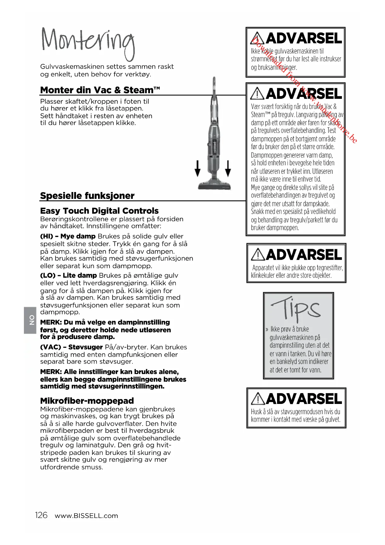 ADVARSEL SLIK REDUSERER DU FAREN FOR BRANN, ELEKTRISK STØT ELLER SKADER:» Dette apparatet kan brukes av barn fra 8 år og oppover, og personer med reduserte fysiske, sensoriske eller mentale evner eller manglende erfaring og kunnskap, så lenge de har mottatt veiledning eller instruksjon om bruk av apparatet på en sikker måte, og forstår hvilke farer som er involvert. Rengjøring og brukervedlikehold skal ikke foretas avbarn med mindre de er under oppsyn. » Barn bør være under oppsyn for å sikre atde ikke leker med apparatet. » Hvis kabelen skades, må den erstattes av produsenten, serviceverkstedet ellertilsvarende kvalifisert person for åunngå fare. » Hold hår, løstsittende klær, fingre ogalle kroppsdeler unna åpningene ogde bevegelige delene i apparatet ogekstrautstyret. » Ikke forlat apparatet mens det er tilkoblet strømnettet.» Ta kontakten ut av stikkontakten når den ikke er i bruk og før vedlikehold.» Må ikke brukes som en leke.» Må kun brukes som beskrevet i denne brukerhåndboken.» Bruk kun ekstrautstyr som anbefales av produsenten.» Må ikke brukes hvis ledningen eller kontakten er ødelagt.» Må ikke nedsenkes i vann eller annen væske.» Hvis apparatet ikke fungerer som det skal, har falt ned, harblitt skadet, har stått utendørs eller har blitt nedsenket i vann, må du ikke prøve å bruke det. Lever apparatet til etautorisert serviceverksted.» Ikke dra eller bær apparatet etter ledningen, ikke bruk ledningen som håndtak, ikke lukk døren over ledningen ellerdra ledningen rundt skarpe kanter eller hjørner.» Ikke kjør apparatet over ledningen.» Hold ledningen unna varme overflater.» Ikke koble fra ved å dra i ledningen.» Ta tak i kontakten, ikke ledningen, for å koble fra.» Ikke håndter støpslet eller apparatet med våte hender.» Ikke plasser noen gjenstander i åpningene.» Må ikke brukes mens noen av åpningene er blokkert. Holdåpningene fri for støv, lo, hår og alt som kan redusere luftstrømningen.» Slå av alle kontroller før du kobler fra.» Vær ekstra forsiktig ved rengjøring i trapper.» Må ikke brukes for å ta opp brannfarlige væsker, for eksempel bensin, eller brukes i områder hvor slike stoffer kan finnes.» Ikke samle opp giftig materiale (klorblekemiddel, ammoniakk, avløpsrenser osv.)» Ikke bruk apparatet i et lukket rom fylt med damp fra oljemaling, løsemidler, midler for møllimpregnering, brennbart støv eller andre eksplosive eller giftige damper.» Ikke samle opp harde eller skarpe gjenstander som glass, spikre, skruer, mynter osv.» Bruk kun på tørre innendørs overflater.» Hold apparatet på et plant underlag.» Ikke samle opp noe som brenner eller ryker, for eksempel sigaretter, fyrstikker eller varm aske.» Ikke bruk uten støvposen og/eller filtrene på plass.» Ikke bruk utendørs eller på våte overflater» Dette apparatet er utstyrt med dobbel isolasjon. Kunoriginale reservedeler brukes. » Ikke la maskinen stå og gå på samme sted uten athåndtaket er helt vertikalt.» Apparatet skal ikke brukes hvis det har falt ned, harsynligetegn på skade eller har lekkasjer. » Hold apparatet utenfor barns rekkevidde mens det erpåslått eller kjøles ned. » Overflaten på foten blir gjerne varm under bruk. » Ikke rett damp mot mennesker, dyr eller utstyr som inneholder elektriske komponenter.» Ikke bruk apparatet på lær, vokspolerte møbler eller gulv, syntetisk tøy, fløyel eller andre ømfintlige, dampsensitive materialer. TA VARE PÅ DISSE INSTRUKSENE. SKAL KUN BRUKES VED EN STRØMFORSYNING PÅ 220–240 VOLT VEKSELSTRØM 50-60 HZ. Denne modellen er kun til husholdningsbruk. Downloaded from www.vandenborre.beNO www.BISSELL.com