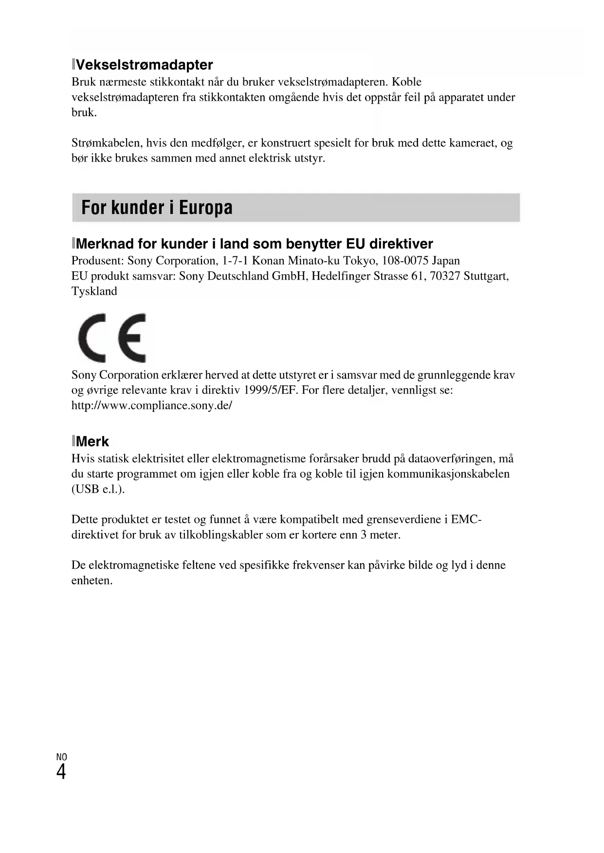 [ Vekselstrømadapter Bruk nærmeste stikkontakt når du bruker vekselstrømadapteren. Koble vekselstrømadapteren fra stikkontakten omgående hvis det oppstår feil på apparatet under bruk. Strømkabelen, hvis den medfølger, er konstruert spesielt for bruk med dette kameraet, og bør ikke brukes sammen med annet elektrisk utstyr. [ Merknad for kunder i land som benytter EU direktiver Produsent: Sony Corporation, 1-7-1 Konan Minato-ku Tokyo, 108-0075 Japan EU produkt samsvar: Sony Deutschland GmbH, Hedelfinger Strasse 61, 70327 Stuttgart, Tyskland Sony Corporation erklærer herved at dette utstyret er i samsvar med de grunnleggende krav og øvrige relevante krav i direktiv 1999/5/EF. For flere detaljer, vennligst se: http://www.compliance.sony.de/ [ Merk Hvis statisk elektrisitet eller elektromagnetisme forårsaker brudd på dataoverføringen, må du starte programmet om igjen eller koble fra og koble til igjen kommunikasjonskabelen (USB e.l.). Dette produktet er testet og funnet å være kompatibelt med grenseverdiene i EMC- direktivet for bruk av tilkoblingskabler som er kortere enn 3 meter. De elektromagnetiske feltene ved spesifikke frekvenser kan påvirke bilde og lyd i denne enheten. For kunder i EuropaNO