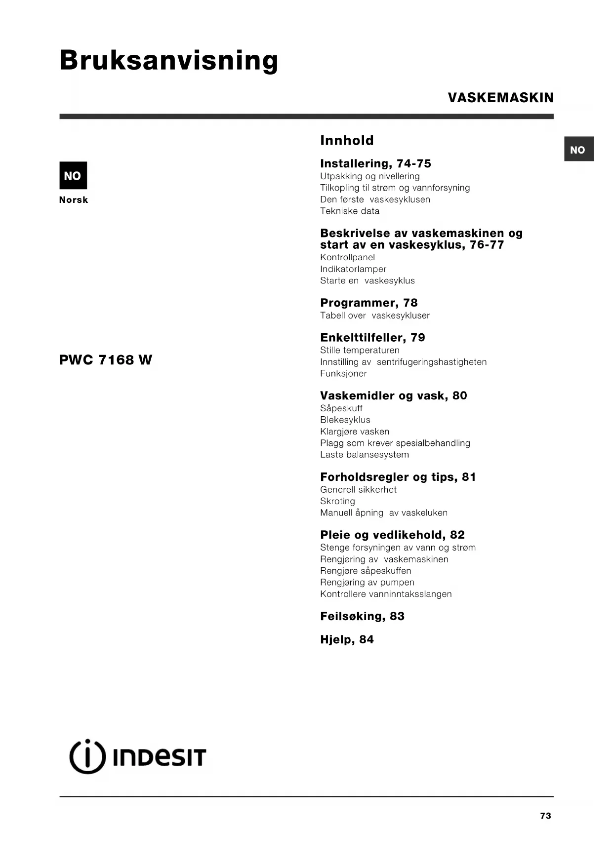 Norsk Innhold Installering, 74-75 Utpakking og nivellering Tilkopling til strøm og vannforsyning Den første vaskesyklusen Tekniske data Beskrivelse av vaskemaskinen og start av en vaskesyklus, 76-77 Kontrollpanel Indikatorlamper Starte en vaskesyklus Programmer, 78 Tabell over vaskesykluser Enkelttilfeller, 79 Stille temperaturen Innstilling av sentrifugeringshastigheten Funksjoner Vaskemidler og vask, 80 Såpeskuff Blekesyklus Klargjøre vasken Plagg som krever spesialbehandling Laste balansesystem Forholdsregler og tips, 81 Generell sikkerhet Skroting Manuell åpning av vaskeluken Pleie og vedlikehold, 82 Stenge forsyningen av vann og strøm Rengjøring av vaskemaskinen Rengjøre såpeskuffen Rengjøring av pumpen Kontrollere vanninntaksslangen Feilsøking, 83 Hjelp, 84