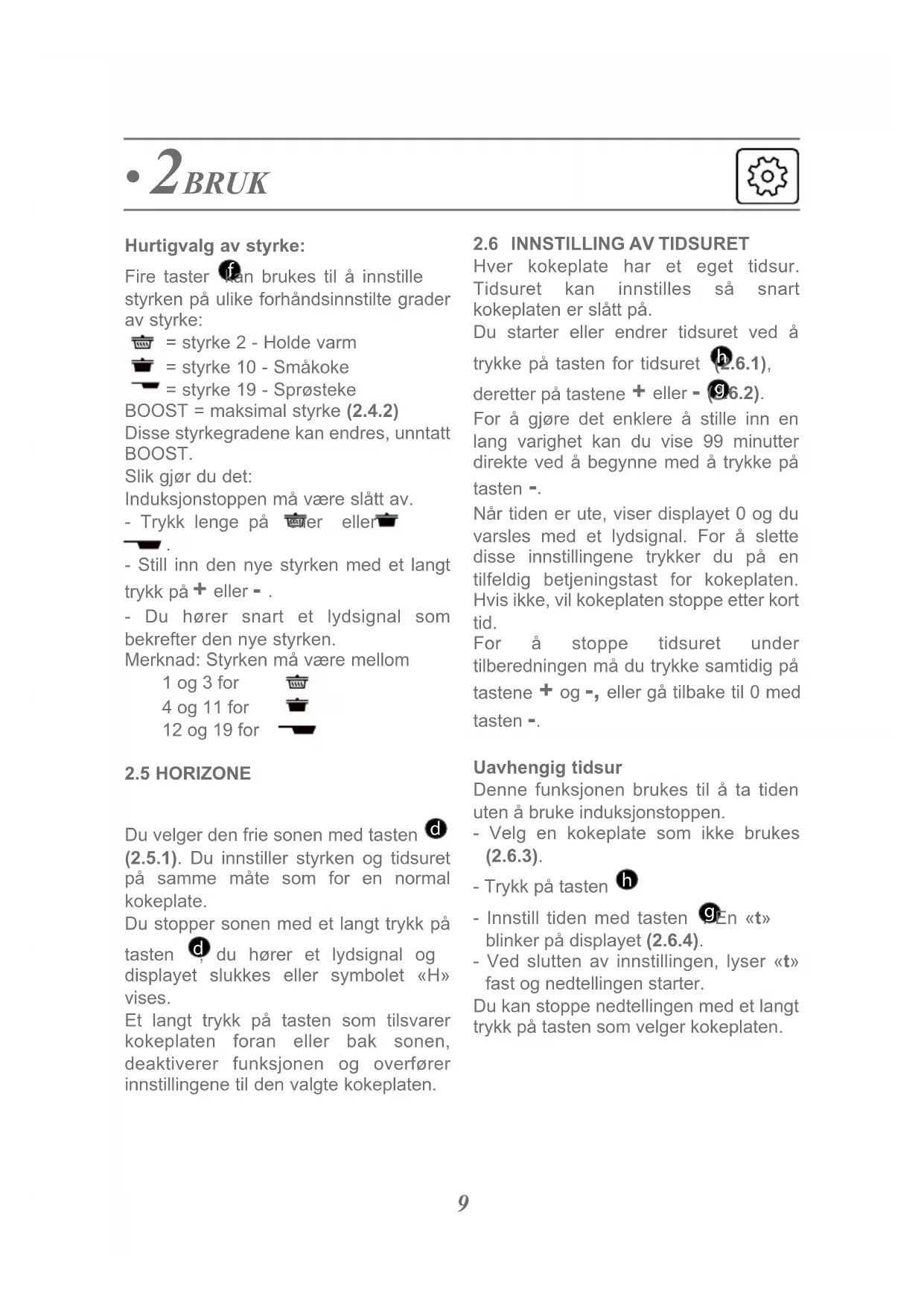 2BRUK Forklaring på symbolene = Av/På = Låsing / Clean Lock = Velge kokeplate = Horizone = Display = Forhåndsvalg = Innstilling av styrke/tid = Tidsur = Funksjon Elapsed time = Funksjon Recall = Funksjon Boil = Funksjon Grill = Funksjon Piano