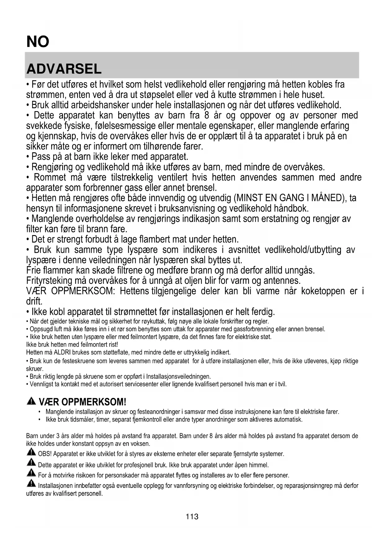- Ikke bruk hetten uten lyspære eller med feilmontert lyspære, da det finnes fare for elektriske støt. Ikke bruk hetten med feilmontert rist! Hetten må ALDRI brukes som støtteflate, med mindre dette er uttrykkelig indikert.