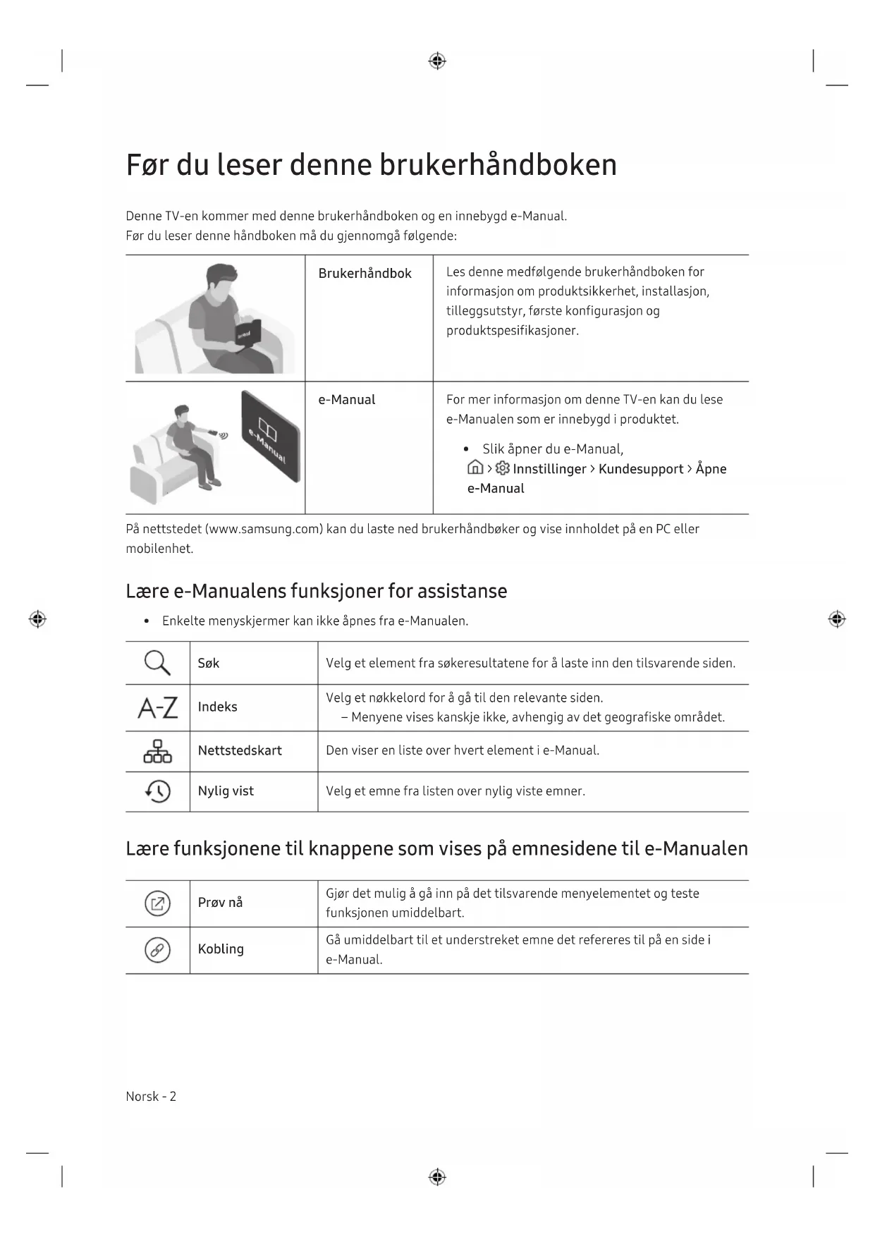 - Slik åpner du e-Manual, > Innstillinger > Kundesupport > Åpne e-Manual På nettstedet (www.samsung.com) kan du laste ned brukerhåndbøker og vise innholdet på en PC eller mobilenhet. Lære e-Manualens funksjoner for assistanse