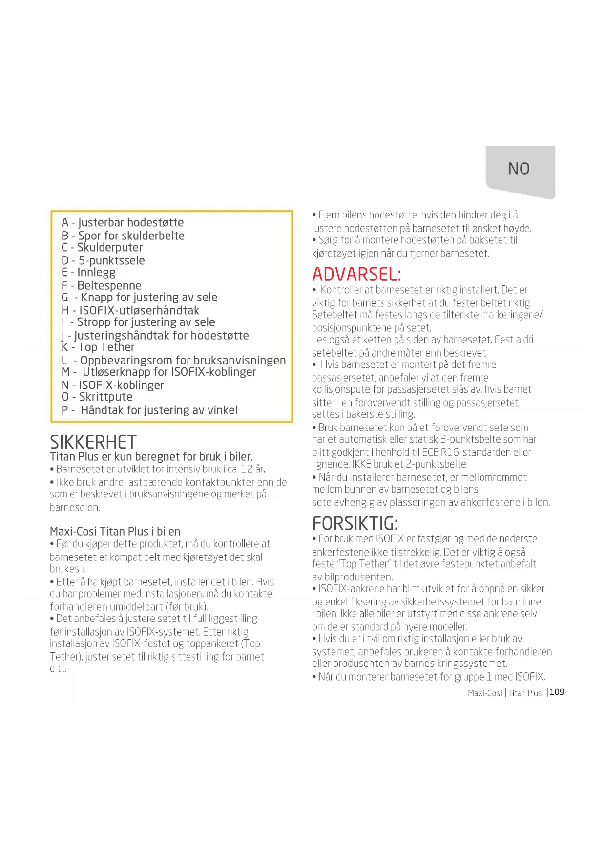 A - Justerbar hodestøtte B - Spor for skulderbelte C - Skulderputer D - 5-punktssele E - Innlegg F - Beltespenne G - Knapp for justering av sele H - ISOFIX-utløserhåndtak I - Stropp for justering av sele J - Justeringshåndtak for hodestøtte K - Top Tether L - Oppbevaringsrom for bruksanvisningen M - Utløserknapp for ISOFIX-koblinger N - ISOFIX-koblinger O - Skrittpute P - Håndtak for justering av vinkel110