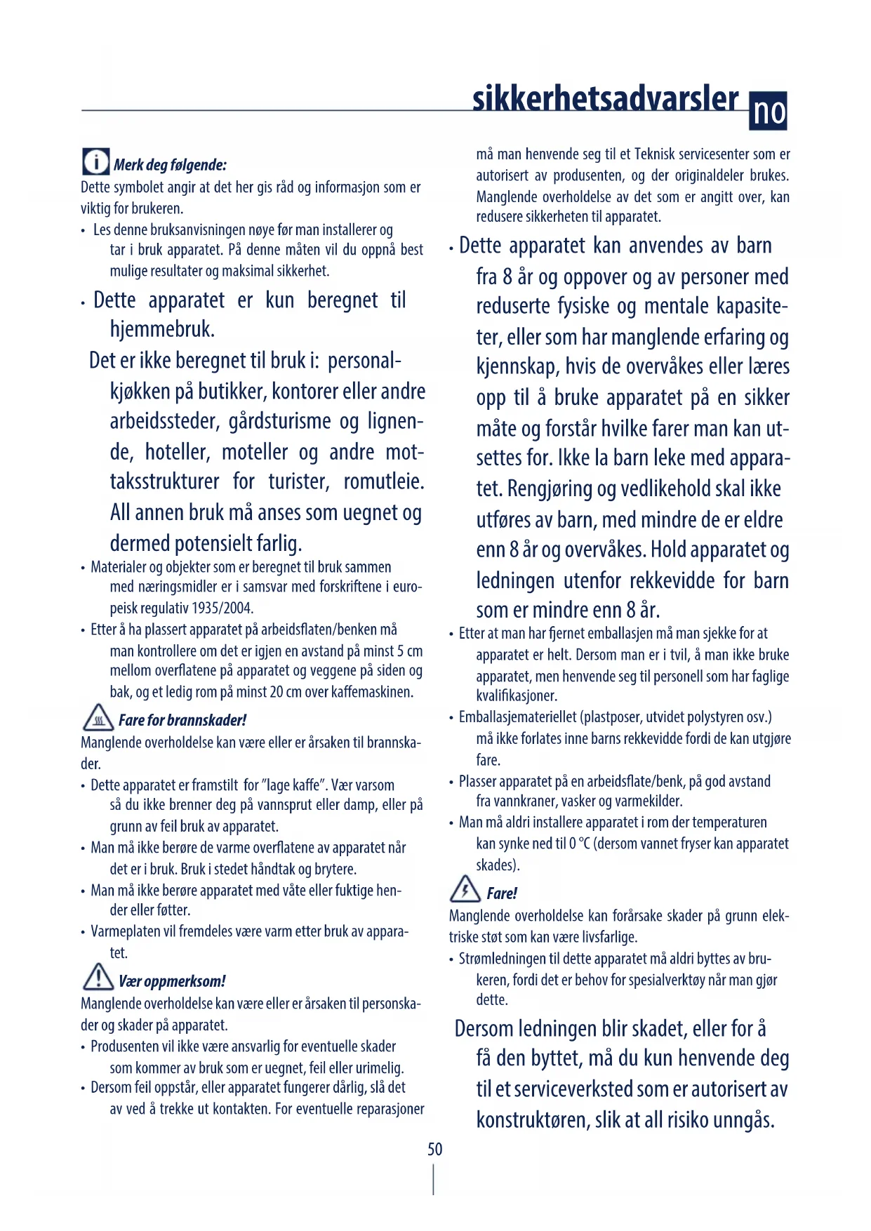 - Dersom feil oppstår, eller apparatet fungerer dårlig, slå det av ved å trekke ut kontakten. For eventuelle reparasjoner må man henvende seg til et Teknisk servicesenter som er autorisert av produsenten, og der originaldeler brukes. Manglende overholdelse av det som er angitt over, kan redusere sikkerheten til apparatet.