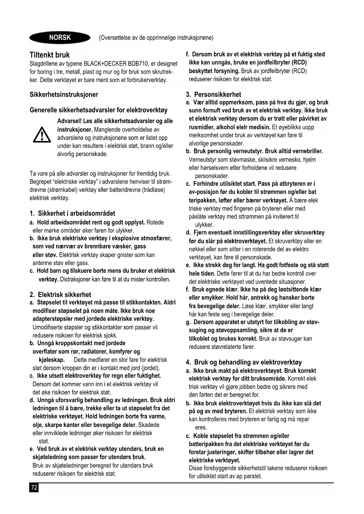 Stille inn boredybden (g. G) uLøsne sidehåndtaket (7) ved å vri håndtaket mot klokken. uStill dybdestoppen (6) til ønsket stilling. Maksimal boredypde tilsvarer avstanden mellom spissen på boret og forparten av dybdestoppen. uStram sidehåndtaket ved å vri håndtaket med klokken. Start og stopp uNår du skal slå verktøyet på, trykker du på på/avbryteren for variabel hastighet (1). Verktøyhastigheten avhenger av hvor langt du trykker bryteren. Bruk lav hastighet for bor med stor diameter og høy hastighet for bor med mindre diameter. uHvis du ønsker å holde verktøyet i kontinuerlig drift, trykker du inn låseknappen (2) og slipper av/på-knappen for variable hastighet. Dette valget er bare tilgjengelig ved full hastighet ved rotasjon fremover og bakover. uNår du skal slå verktøyet av, slipper du på/av-bryteren for variabel hastighet. Hvis du vil slå av verktøyet mens det er i kontinuerlig drift, trykker du inn av/på-knappen for variabel hastighet én gang til og slipper den. Tilbehør Verktøyets ytelse avhenger av hva slags tilbehør som brukes. Tilbehør fra BLACK+DECKER er produsert etter høye kvalitetsstandarder og er konstruert for å bedre verktøyets ytelse. Hvis du bruker dette tilbehøret, får du mest mulig ut av verktøyet ditt. Vedlikehold BLACK+DECKER-apparatet/-verktøyet med ledning/bat- teri er laget for å brukes over lang tid med et minimum av vedlikehold. For at den skal fungere tilfredsstillende over tid, er det viktig å sørge for riktig stell av verktøyet og regelmessig renhold. Advarsel! Før du utfører vedlikehold på kabede/ ytådløse elektroverktøy: uSlå av apparatet/verktøyet og trekk ut støpselet. uSlå apparatet av og ta ut batteriet fra enheten/ verktøyet hvis enheten/verktøyet har separate batteripa- kker. uEller la batteriet gå helt tomt hvis det er innebygd, og slå deretter av. uTrekk ut laderen fra stikkontakten før du rengjør den. Laderen din krever ikke annet vedlikehold enn regelmessig rengjøring. uRengjør ventilasjonsåpningene i verktøyet jevnlig med en myk børste eller tørr klut. uRengjør motorhuset regelmessig med en fuktig klut. Ikke bruk slipende eller løsemiddelbaserte rengjøringsmidler. uÅpne chucken regelmessig, og bank på den for å fjerne eventuelt støv fra innsiden (når den er montert). Skifte støpsel (bare Storbritannia og Irland) Dersom du trenger å sette på et nytt støpsel: uKast det gamle støpselet på en trygg måte. uKoble den brune ledningen til den strømførende termina- len i det nye støpselet. uKoble den blå ledningen til den nøytrale terminalen. Advarsel! Jordingslederen skal ikke kobles til. Følg mon- teringsanvisningen som medfølger støpsler av god kvalitet. Anbefalt sikring: 5 A. Miljøvern Separat avfallshåndtering. Produkter og batterier merket med dette symbolet skal ikke kastes i vanlig husholdningsavfall. Produkter og batterier inneholder materialer som kan gjenbrukes eller gjenvinnes for å redusere behovet for nye råmaterialer. Vennligst lever elektrisk utstyr og batterier til gjenbruk i hen- hold til lokale regler. Mer informasjon nner du på www.2helpU.com Tekniske data BDB710 Inngangsspenning V