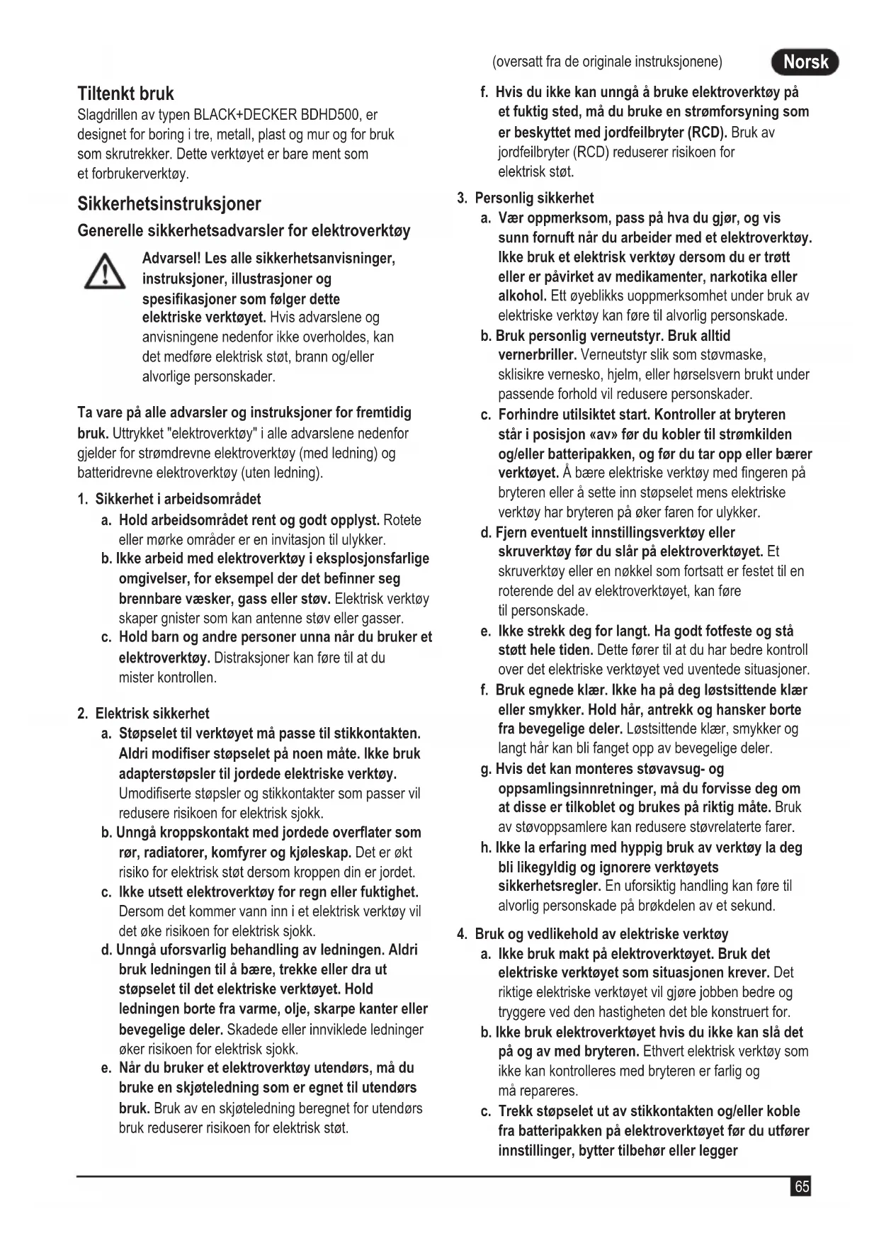 (oversatt fra de originale instruksjonene) Norsk (oversatt fra de originale instruksjonene) Tiltenkt bruk Slagdrillen av typen BLACK+DECKER BDHD500, er designet for boring i tre, metall, plast og mur og for bruk som skrutrekker. Dette verktøyet er bare ment som et forbrukerverktøy. Sikkerhetsinstruksjoner Generelle sikkerhetsadvarsler for elektroverktøy Advarsel! Les alle sikkerhetsanvisninger, instruksjoner, illustrasjoner og spesikasjoner som følger dette elektriske verktøyet. Hvis advarslene og anvisningene nedenfor ikke overholdes, kan det medføre elektrisk støt, brann og/eller alvorlige personskader. Ta vare på alle advarsler og instruksjoner for fremtidig bruk. Uttrykket "elektroverktøy" i alle advarslene nedenfor gjelder for strømdrevne elektroverktøy (med ledning) og batteridrevne elektroverktøy (uten ledning).