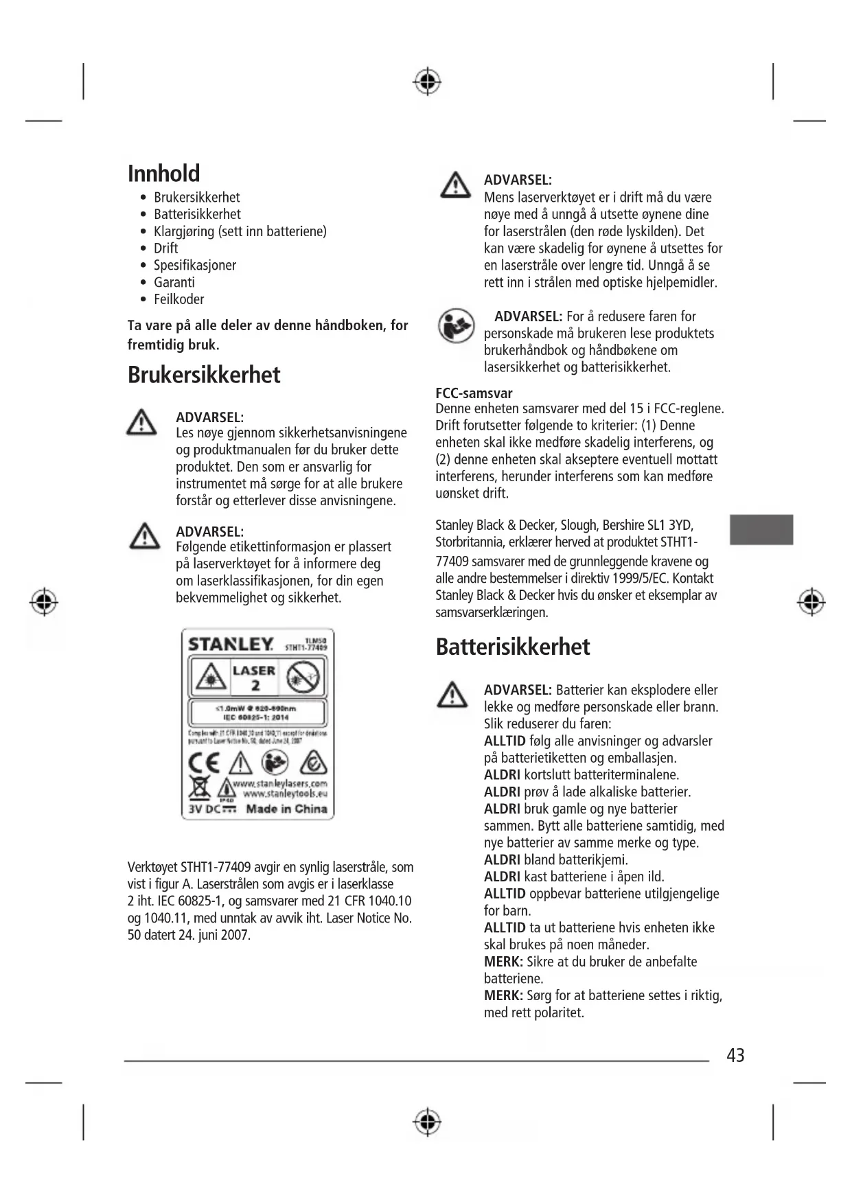 - Feilkoder Ta vare på alle deler av denne håndboken, for fremtidig bruk. Brukersikkerhet ADVARSEL: Les nøye gjennom sikkerhetsanvisningene og produktmanualen før du bruker dette produktet. Den som er ansvarlig for instrumentet må sørge for at alle brukere forstår og etterlever disse anvisningene. ADVARSEL: Følgende etikettinformasjon er plassert på laserverktøyet for å informere deg om laserklassikasjonen, for din egen bekvemmelighet og sikkerhet. Verktøyet STHT1-77409 avgir en synlig laserstråle, som vist i figur A. Laserstrålen som avgis er i laserklasse 2 iht. IEC 60825-1, og samsvarer med 21 CFR 1040.10 og 1040.11, med unntak av avvik iht. Laser Notice No. 50 datert 24. juni 2007. ADVARSEL: Mens laserverktøyet er i drift må du være nøye med å unngå å utsette øynene dine for laserstrålen (den røde lyskilden). Det kan være skadelig for øynene å utsettes for en laserstråle over lengre tid. Unngå å se rett inn i strålen med optiske hjelpemidler. ADVARSEL: For å redusere faren for personskade må brukeren lese produktets brukerhåndbok og håndbøkene om lasersikkerhet og batterisikkerhet. FCC-samsvar Denne enheten samsvarer med del 15 i FCC-reglene. Drift forutsetter følgende to kriterier: (1) Denne enheten skal ikke medføre skadelig interferens, og (2) denne enheten skal akseptere eventuell mottatt interferens, herunder interferens som kan medføre uønsket drift. Stanley Black & Decker, Slough, Bershire SL1 3YD, Storbritannia, erklærer herved at produktet STHT1- 77409 samsvarer med de grunnleggende kravene og alle andre bestemmelser i direktiv 1999/5/EC. Kontakt Stanley Black & Decker hvis du ønsker et eksemplar av samsvarserklæringen. Batterisikkerhet ADVARSEL: Batterier kan eksplodere eller lekke og medføre personskade eller brann. Slik reduserer du faren: ALLTID følg alle anvisninger og advarsler på batterietiketten og emballasjen. ALDRI kortslutt batteriterminalene. ALDRI prøv å lade alkaliske batterier. ALDRI bruk gamle og nye batterier sammen. Bytt alle batteriene samtidig, med nye batterier av samme merke og type. ALDRI bland batterikjemi. ALDRI kast batteriene i åpen ild. ALLTID oppbevar batteriene utilgjengelige for barn. ALLTID ta ut batteriene hvis enheten ikke skal brukes på noen måneder. MERK: Sikre at du bruker de anbefalte batteriene. MERK: Sørg for at batteriene settes i riktig, med rett polaritet. 43Klargjøring (sett inn batteriene)