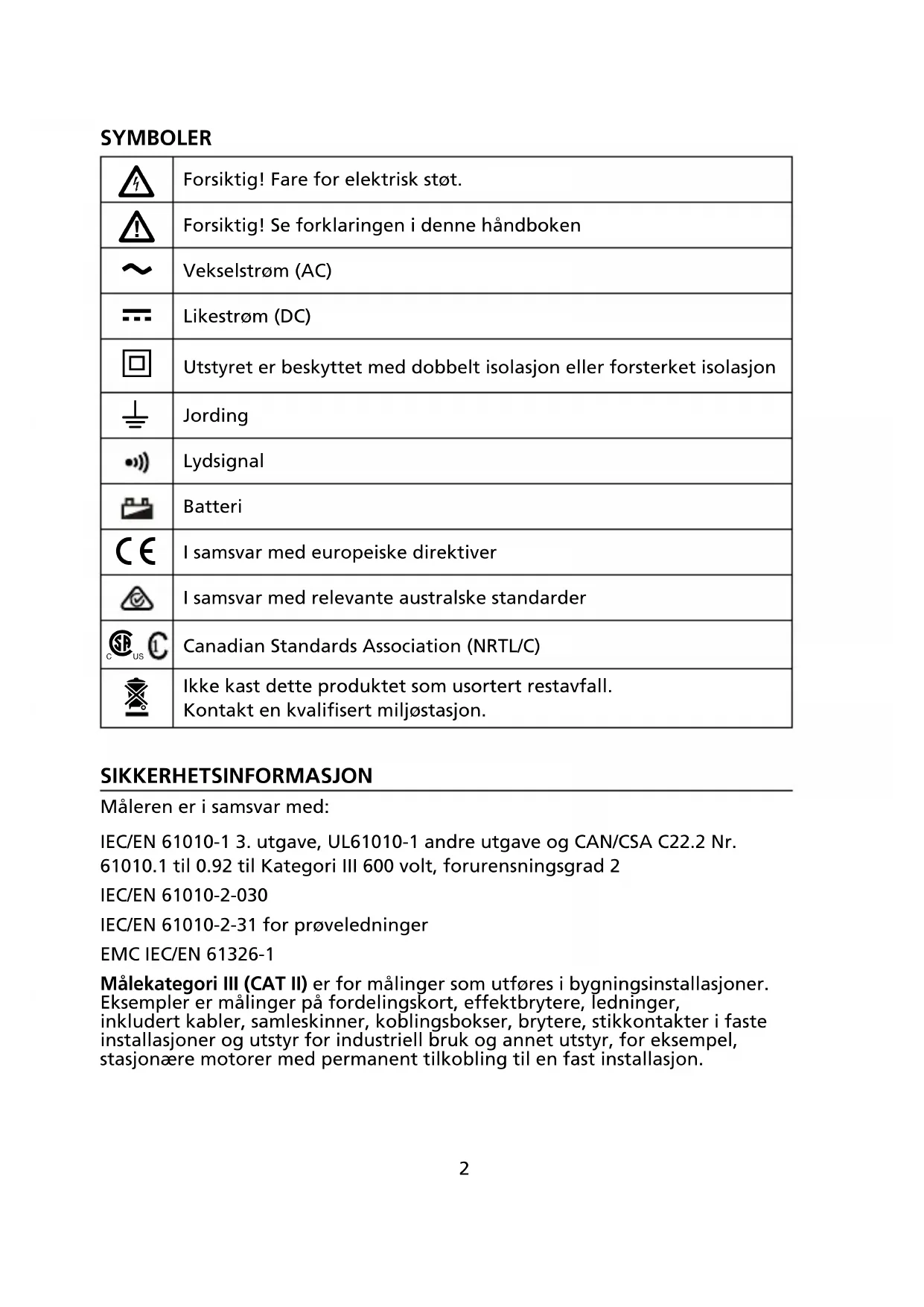 Målekategori III (CAT II) er for målinger som utføres i bygningsinstallasjoner. Eksempler er målinger på fordelingskort, effektbrytere, ledninger, inkludert kabler, samleskinner, koblingsbokser, brytere, stikkontakter i faste installasjoner og utstyr for industriell bruk og annet utstyr, for eksempel, stasjonære motorer med permanent tilkobling til en fast installasjon.3 Målekategori II (CAT II) er for målinger utført direkte på krets knyttet til lavspenningsanlegg. Eksempler er målinger på husholdningsapparater, mobile verktøy og lignende utstyr. XADVARSEL: Les før bruk