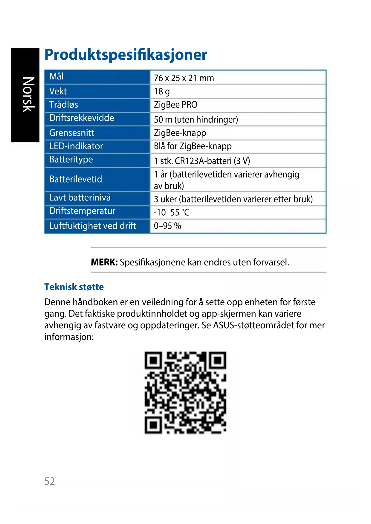 DanskProduktspesikasjoner Mål 76 x 25 x 21mm Vekt 18 g Trådløs ZigBee PRO Driftsrekkevidde 50 m (uten hindringer) Grensesnitt ZigBee-knapp LED-indikator Blå for ZigBee-knapp Batteritype 1 stk. CR123A-batteri (3 V) Batterilevetid 1 år (batterilevetiden varierer avhengig av bruk) Lavt batterinivå 3 uker (batterilevetiden varierer etter bruk) Driftstemperatur -10–55°C Luftfuktighet ved drift 0–95% MERK: Spesikasjonene kan endres uten forvarsel. Teknisk støtte Denne håndboken er en veiledning for å sette opp enheten for første gang. Det faktiske produktinnholdet og app-skjermen kan variere avhengig av fastvare og oppdateringer. Se ASUS-støtteområdet for mer informasjon: