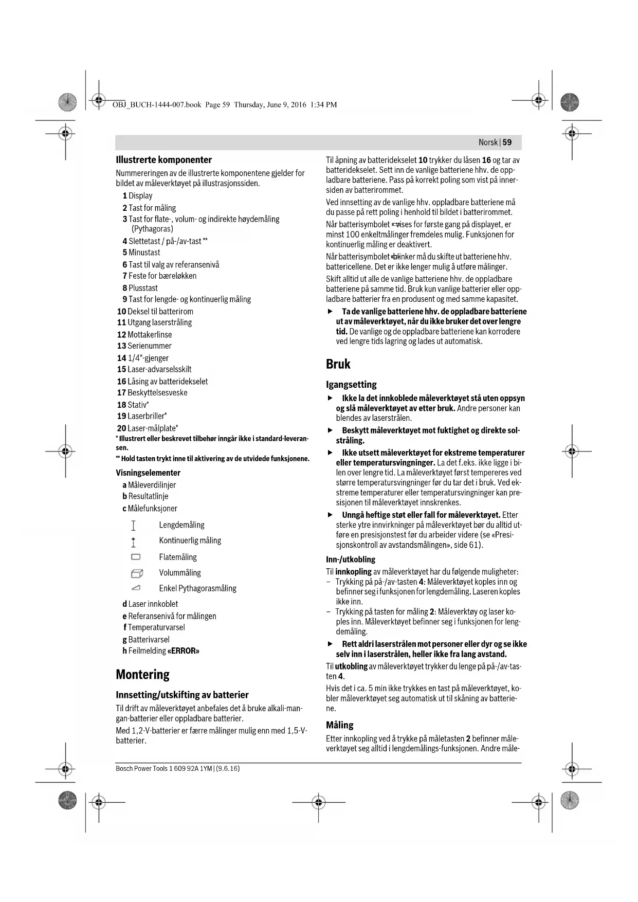 - Illustrert eller beskrevet tilbehør inngår ikke i standard-leveran- sen. ** Hold tasten trykt inne til aktivering av de utvidede funksjonene. Visningselementer a Måleverdilinjer b Resultatlinje c Målefunksjoner d Laser innkoblet e Referansenivå for målingen f Temperaturvarsel g Batterivarsel h Feilmelding «ERROR» Montering Innsetting/utskifting av batterier Til drift av måleverktøyet anbefales det å bruke alkali-man- gan-batterier eller oppladbare batterier. Med 1,2-V-batterier er færre målinger mulig enn med 1,5-V- batterier. Til åpning av batteridekselet 10 trykker du låsen 16 og tar av batteridekselet. Sett inn de vanlige batteriene hhv. de opp- ladbare batteriene. Pass på korrekt poling som vist på inner- siden av batterirommet. Ved innsetting av de vanlige hhv. oppladbare batteriene må du passe på rett poling i henhold til bildet i batterirommet. Når batterisymbolet vises for første gang på displayet, er minst 100 enkeltmålinger fremdeles mulig. Funksjonen for kontinuerlig måling er deaktivert. Når batterisymbolet blinker må du skifte ut batteriene hhv. battericellene. Det er ikke lenger mulig å utføre målinger. Skift alltid ut alle de vanlige batteriene hhv. de oppladbare batteriene på samme tid. Bruk kun vanlige batterier eller opp- ladbare batterier fra en produsent og med samme kapasitet. Ta de vanlige batteriene hhv. de oppladbare batteriene ut av måleverktøyet, når du ikke bruker det over lengre tid. De vanlige og de oppladbare batteriene kan korrodere ved lengre tids lagring og lades ut automatisk. Bruk Igangsetting Ikke la det innkoblede måleverktøyet stå uten oppsyn og slå måleverktøyet av etter bruk. Andre personer kan blendes av laserstrålen. Beskytt måleverktøyet mot fuktighet og direkte sol- stråling. Ikke utsett måleverktøyet for ekstreme temperaturer eller temperatursvingninger. La det f.eks. ikke ligge i bi- len over lengre tid. La måleverktøyet først tempereres ved større temperatursvingninger før du tar det i bruk. Ved ek- streme temperaturer eller temperatursvingninger kan pre- sisjonen til måleverktøyet innskrenkes. Unngå heftige støt eller fall for måleverktøyet. Etter sterke ytre innvirkninger på måleverktøyet bør du alltid ut- føre en presisjonstest før du arbeider videre (se «Presi- sjonskontroll av avstandsmålingen», side 61). Inn-/utkobling Til innkopling av måleverktøyet har du følgende muligheter: –Trykking på på-/av-tasten 4: Måleverktøyet koples inn og befinner seg i funksjonen for lengdemåling. Laseren koples ikke inn. – Trykking på tasten for måling 2: Måleverktøy og laser ko- ples inn. Måleverktøyet befinner seg i funksjonen for leng- demåling. Rett aldri laserstrålen mot personer eller dyr og se ikke selv inn i laserstrålen, heller ikke fra lang avstand. Til utkobling av måleverktøyet trykker du lenge på på-/av-tas- ten 4. Hvis det i ca. 5 min ikke trykkes en tast på måleverktøyet, ko- bler måleverktøyet seg automatisk ut til skåning av batterie- ne. Måling Etter innkopling ved å trykke på måletasten 2 befinner måle- verktøyet seg alltid i lengdemålings-funksjonen. Andre måle- Lengdemåling Kontinuerlig måling Flatemåling Volummåling Enkel Pythagorasmåling OBJ_BUCH-1444-007.book Page 59 Thursday, June 9, 2016 1:34 PM60 | Norsk 1 609 92A 1YM | (9.6.16) Bosch Power Tools funksjoner kan du innstille ved å trykke på den aktuelle funk- sjonstasten (se «Målefunksjoner», side 60). Som referansenivå for målingen er det valgt bakkanten på må- leverktøyet etter innkopling. Ved å trykke på tasten for refe- ransenivå 6 kan du endre referansenivået (se «Valg av refe- ransenivå (se bilde A)», side 60). Legg måleverktøyet med valgt referansenivå mot ønsket start- punkt for målingen (f.eks. veggen). Trykk kort på tasten for måling 2 til innkobling av laserstrålen. Rett aldri laserstrålen mot personer eller dyr og se ikke selv inn i laserstrålen, heller ikke fra lang avstand. Rett laserstrålen mot målflaten. Trykk kort en gang til på tas- ten for måling 2 til utløsing av målingen. I funksjonen kontinuerlig måling starter målingen straks funk- sjonen innkoples. Måleverdien vises typisk i løpet av 0,5 s og senest etter 4 s. Målingens varighet er avhengig av avstanden, lysforholdene og refleksjonsegenskapene til målflaten. Etter målingen ko- bles laserstrålen automatisk ut. Hvis det ikke utføres en måling ca. 20 s etter siktingen, kobles laserstrålen automatisk ut for å skåne batteriene. Valg av referansenivå (se bilde A) Til målingen kan du velge tre forskjellige referansenivåer: – bakkanten på måleverktøyet (f.eks. legging mot en vegg), – forkanten på måleverktøyet (f.eks. ved måling fra en bord- kant), – midten på gjengene 14 (f.eks. til måling med stativ). Til valg av referansenivået trykker du flere ganger på tasten 6 helt til ønsket referansenivå vises på displayet. Etter hver inn- kobling av måleverktøyet er bakkanten på måleverktøyet for- håndsinnstilt som referansenivå. Displaybelysning Displaybelysningen aktiveres automatisk avhengig av lysstyr- ken i omgivelsene. Hvis det ikke trykkes på en tast etter inn- koplingen av displaybelysningen, dimmes den for å skåne bat- teriene. Målefunksjoner Enkel lengdemåling (se bilde B) Til lengdemålinger trykker du så mange ganger på tasten 9, til displayet viser meldingen for lengdemåling . Til innkopling av laseren og til måling tryk- ker du en gang kort på måletasten 2. Måleverdien anvises i resultatlinje b. Ved flere lengdemålinger etter hverandre anvises resultatene for de siste målingene i måleverdilinjene a. Flatemåling (se bilde C) Til flatemålinger trykker du så mange ganger på tasten 3, til displayet viser meldingen for flatemåling . Mål deretter lengde og bredde etter hverandre som for en lengdemåling. Mellom de to målingene forblir laserstrålen inn- koblet. Etter avslutning av den andre målingen beregne