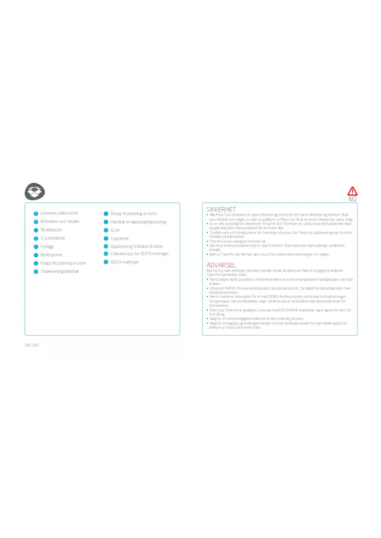 - Hvis du er i tvil om riktig montering eller bruk av systemet, anbefaler vi at brukeren tar kontakt med forhandleren eller produsenten av systemet for sikring av barnet. VEDLIKEHOLD Hold barnesetet rent. Ikke bruk smøremidler eller sterke rengjøringsmidler. Innlegg: Innlegget i Titan Pro-setet spiller en viktig del for eektiviteten til sikringssystemet til barnet ditt (fra 45 til 60 cm – 9 til 18 kg, gruppe 1). Det kan ernes og trekket kan tas av for vasking, men det er viktig å plassere dem tilbake der de hører hjemme, og bare bruke dette originale Maxi-Cosi Titan Pro-innlegget. Dette innlegget er kun ment for bruk med Titan Pro-setet. Sto:
