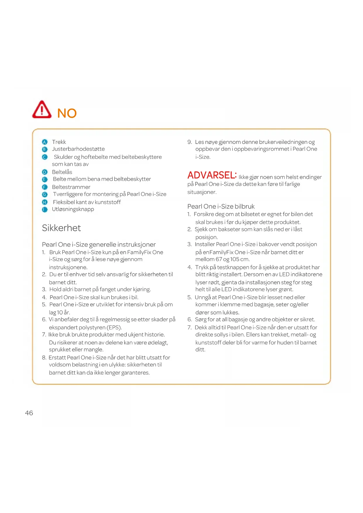 eller aggressive rengjøringsmidler på dette produktet. Miljø Hold all plastikk emballasje utenfor barnets rekkevidde i forbindelse med kvelningsfare. Av miljøhensyn ber vi om at produktet kastes i henhold til lokal lovgivning når det ikke brukes lenger. Spørsmål Dersom du har noen spørsmål kan du ta kontakt med din lokale Maxi-Cosi forhandler. Sørg for at du har følgende informasjon for hånden: - Serienummeret nederst på det oransje ECE klistremerket; - Merke og type bil og seteposisjonen hvor Pearl One i-Size e brukes; - Alder, høyde og vekt til barnet ditt. Garanti Vår 24 måneders garanti gjenspeiler vår tillit til den enestående kvaliteten til produktets design, utvikling, produksjon og ytelse. Vi garanterer at dette produktet ble produsert i henhold til de gjeldene europeiske sikkerhetskrav og kvalitetsstandarder som gjelder dette produktet, og at dette produktet er uten defekter i materialer eller arbeid ved kjøpst- idspunktet. Under betingelsene som nevnes her, kan denne garantien påberopes av forbrukere i land der dette produktet har blitt solgt av et datterselskap av Dorel-gruppen, eller av en autorisert forhandler eller detaljist. Vår 24 måneders garanti dekker alle produksjons- defekter i materialer og arbeid, når det brukes under normale forhold og i henhold til brukerveilednin- gen i en periode på 24 måneder fra datoen til det NO48 opprinnelige kjøpet til den første sluttbrukeren. For å forespørre reservedeler under garantien for defekter i materialer og arbeid må du ha et kjøpsbevis datert i løpet av de siste 24 månedene før tjeneste- forespørselen. Vår 24 måneders garanti dekker ikke skader forår- saket normal bruk og slitasje, skade forårsaket av ulykker, misbruk, uaktsomhet, brann, kontakt med væsker alle annen ekstern årsak, skade forårsaket av at bruksanvisningen ikke er fulgt, skade forårsaket av bruk sammen med et annet produkt, skade forårsaket av service av noen som ikke er autorisert av oss, eller hvis produktet blir stjålet eller om noen etikett eller identifikasjonsnummer er fjernet fra produktet, eller har blitt endret. Eksempler på normal bruk og slitasje inkluderer slitasje på hjul og stoff fra regelmessig bruk og naturlig nedbrytning av farger og materialer på grunn av den normale aldringen av produktet. Hva du skal gjøre i tilfelle defekter: Hvis det oppstår problemer eller defekter får du raskest behandling ved å kontakte din autoriserte forhandler eller detaljist som er anerkjent av oss. Vår 24-måneders garanti er anerkjent av dem (1)