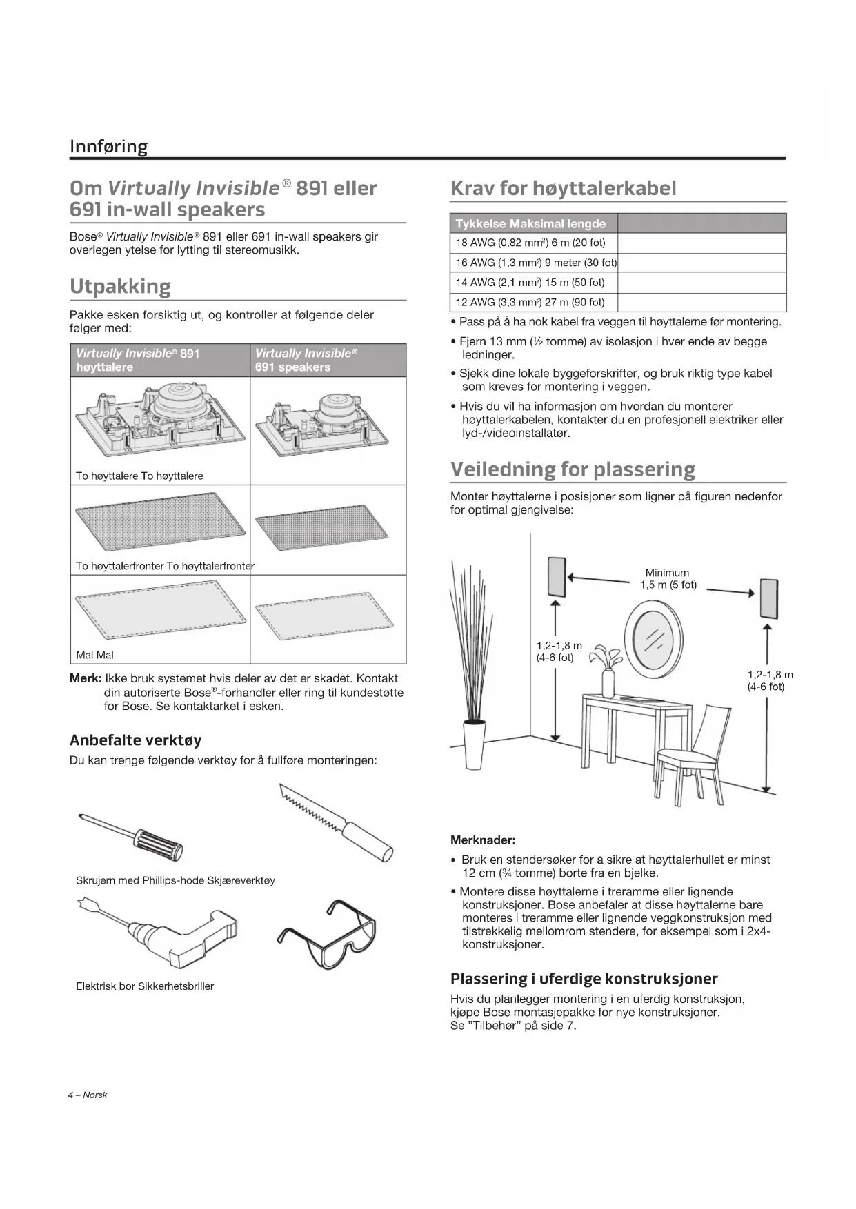 -forhandler eller ring til kundestøtte for Bose. Se kontaktarket i esken. Anbefalte verktøy Du kan trenge følgende verktøy for å fullføre monteringen: Skrujern med Phillips-hode SkjæreverktøyElektrisk bor Sikkerhetsbriller Krav for høyttalerkabel Tykkelse Maksimal lengde 18 AWG (0,82 mm ) 6 m (20 fot)16 AWG (1,3 mm ) 9 meter (30 fot)14 AWG (2,1 mm ) 15 m (50 fot)12 AWG (3,3 mm ) 27 m (90 fot)