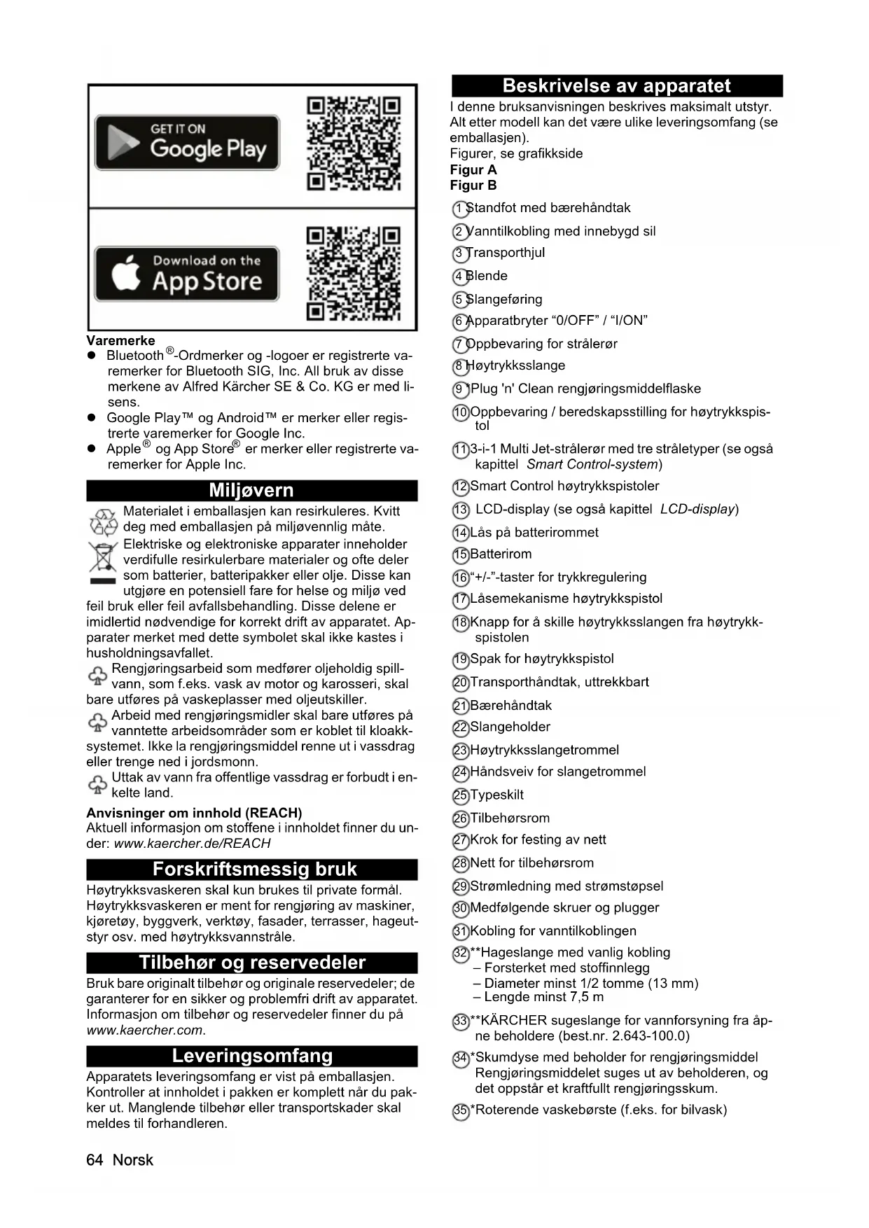 er merker eller registrerte va- remerker for Apple Inc. Miljøvern Materialet i emballasjen kan resirkuleres. Kvitt deg med emballasjen på miljøvennlig måte. Elektriske og elektroniske apparater inneholder verdifulle resirkulerbare materialer og ofte deler som batterier, batteripakker eller olje. Disse kan utgjøre en potensiell fare for helse og miljø ved feil bruk eller feil avfallsbehandling. Disse delene er imidlertid nødvendige for korrekt drift av apparatet. Ap- parater merket med dette symbolet skal ikke kastes i husholdningsavfallet. Rengjøringsarbeid som medfører oljeholdig spill- vann, som f.eks. vask av motor og karosseri, skal bare utføres på vaskeplasser med oljeutskiller. Arbeid med rengjøringsmidler skal bare utføres på vanntette arbeidsområder som er koblet til kloakk- systemet. Ikke la rengjøringsmiddel renne ut i vassdrag eller trenge ned i jordsmonn. Uttak av vann fra offentlige vassdrag er forbudt i en- kelte land. Anvisninger om innhold (REACH) Aktuell informasjon om stoffene i innholdet finner du un- der: www.kaercher.de/REACH Forskriftsmessig bruk Høytrykksvaskeren skal kun brukes til private formål. Høytrykksvaskeren er ment for rengjøring av maskiner, kjøretøy, byggverk, verktøy, fasader, terrasser, hageut- styr osv. med høytrykksvannstråle. Tilbehør og reservedeler Bruk bare originalt tilbehør og originale reservedeler; de garanterer for en sikker og problemfri drift av apparatet. Informasjon om tilbehør og reservedeler finner du på www.kaercher.com. Leveringsomfang Apparatets leveringsomfang er vist på emballasjen. Kontroller at innholdet i pakken er komplett når du pak- ker ut. Manglende tilbehør eller transportskader skal meldes til forhandleren. Beskrivelse av apparatet I denne bruksanvisningen beskrives maksimalt utstyr. Alt etter modell kan det være ulike leveringsomfang (se emballasjen). Figurer, se grafikkside Figur A Figur B 1 Standfot med bærehåndtak 2 Vanntilkobling med innebygd sil 3 Transporthjul 4 Blende 5 Slangeføring 6 Apparatbryter “0/OFF” / “I/ON” 7 Oppbevaring for strålerør 8 Høytrykksslange 9 *Plug 'n' Clean rengjøringsmiddelflaske 10 Oppbevaring / beredskapsstilling for høytrykkspis- tol 11 3-i-1 Multi Jet-strålerør med tre stråletyper (se også kapittel Smart Control-system) 12 Smart Control høytrykkspistoler 13 LCD-display (se også kapittel LCD-display) 14 Lås på batterirommet 15 Batterirom 16 “+/-”-taster for trykkregulering 17 Låsemekanisme høytrykkspistol 18 Knapp for å skille høytrykksslangen fra høytrykk- spistolen 19 Spak for høytrykkspistol 20 Transporthåndtak, uttrekkbart 21 Bærehåndtak 22 Slangeholder 23 Høytrykksslangetrommel 24 Håndsveiv for slangetrommel 25 Typeskilt 26 Tilbehørsrom 27 Krok for festing av nett 28 Nett for tilbehørsrom 29 Strømledning med strømstøpsel 30 Medfølgende skruer og plugger 31 Kobling for vanntilkoblingen 32 **Hageslange med vanlig kobling – Forsterket med stoffinnlegg – Diameter minst 1/2 tomme (13 mm) – Lengde minst 7,5 m 33 **KÄRCHER sugeslange for vannforsyning fra åp- ne beholdere (best.nr. 2.643-100.0) 34 *Skumdyse med beholder for rengjøringsmiddel Rengjøringsmiddelet suges ut av beholderen, og det oppstår et kraftfullt rengjøringsskum. 35 *Roterende vaskebørste (f.eks. for bilvask)Norsk 65